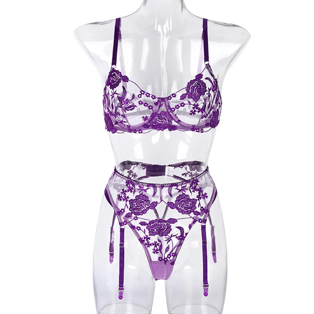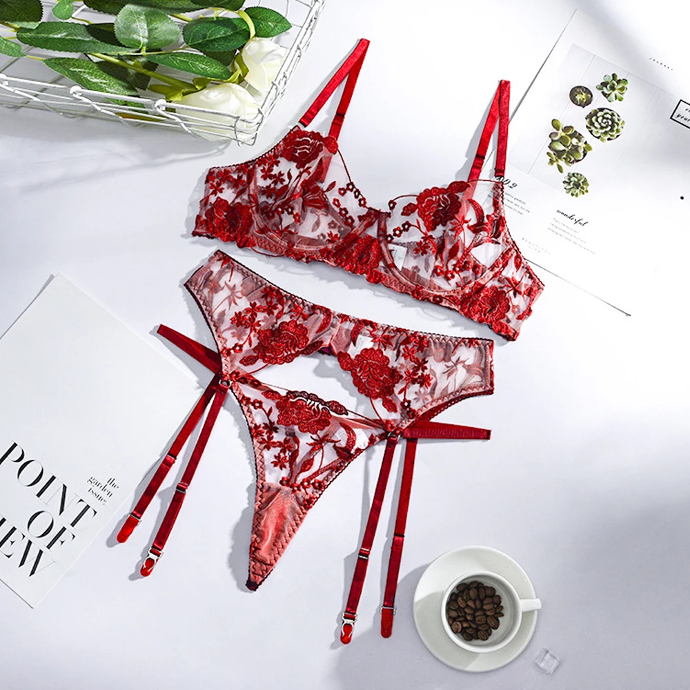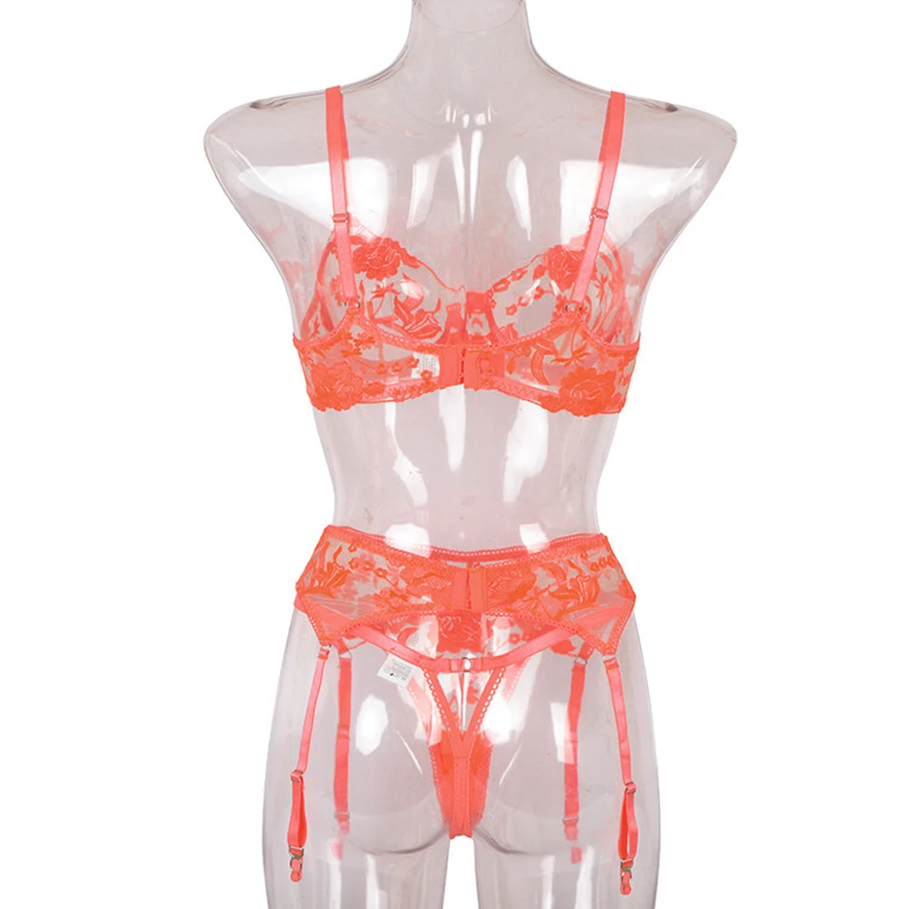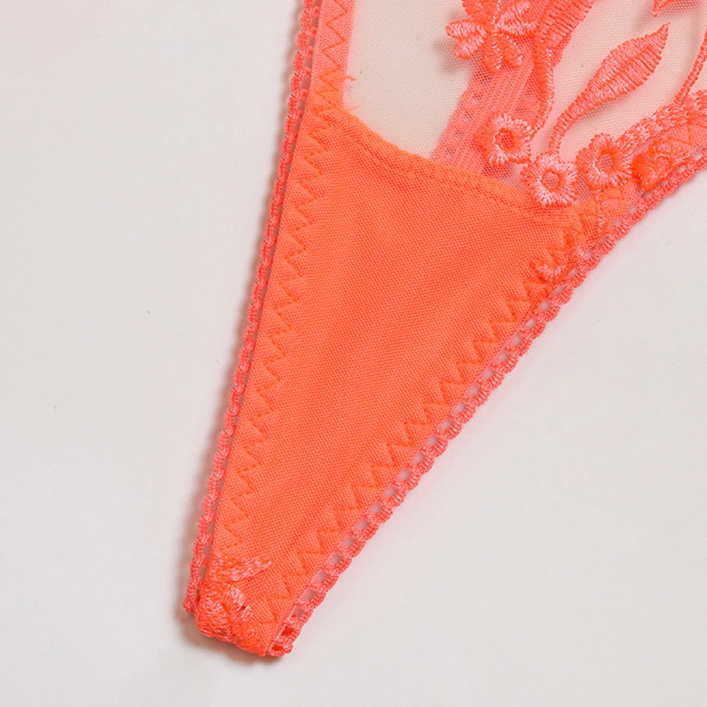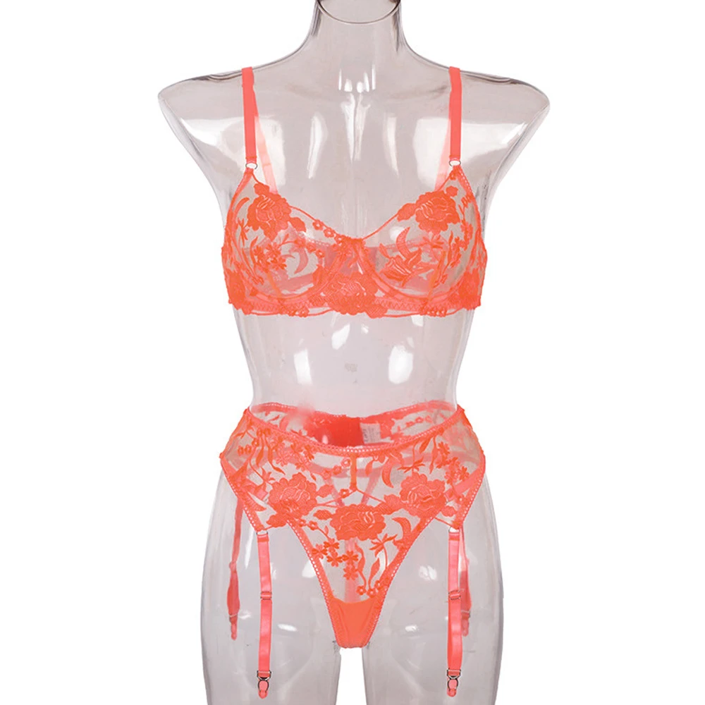 Женское сексуальное нижнее белье с цветочной вышивкой, прозрачный эротический комплект из неонового бюстгальтера с вырезами и трусов, чувственное нижнее белье, комплект из 3 предметов