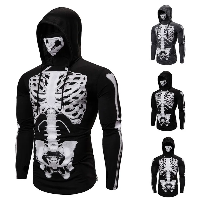 Стрейчевый мужской спортивный свитер, костюм ниндзя, с капюшоном, для Хэллоуина, косплея, с длинными рукавами, с черепом, маска для лица, тонкая толстовка, футболка