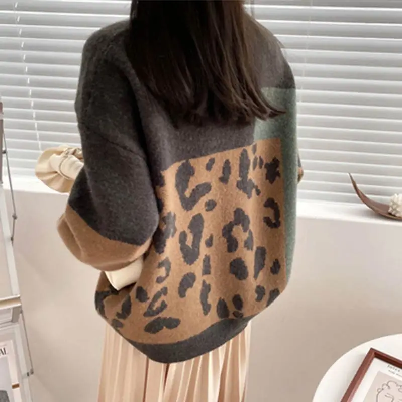 Женский винтажный пуловер с леопардовым принтом, трикотажные джемперы в стиле пэчворк, свободные топы в Корейском стиле, зимние вязаные Джемперы для женщин