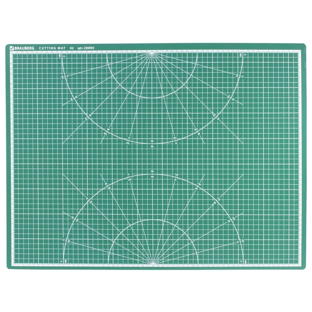 Мат формата А2 выполнен из пластика толщиной 3 мм и имеет трехслойную структуру. Одна сторона коврика имеет разметку в сантиметрах, а другая такую же сантиметровую разметку с добавлением фигур в виде транспортира. Легко очищается мыльной водой.