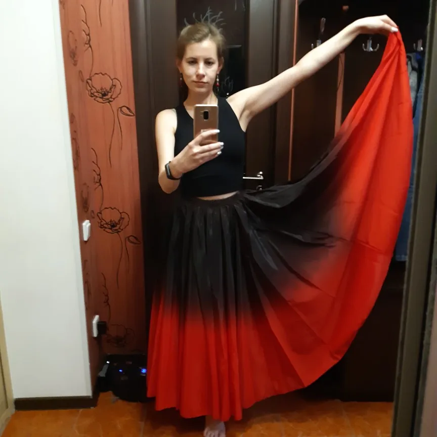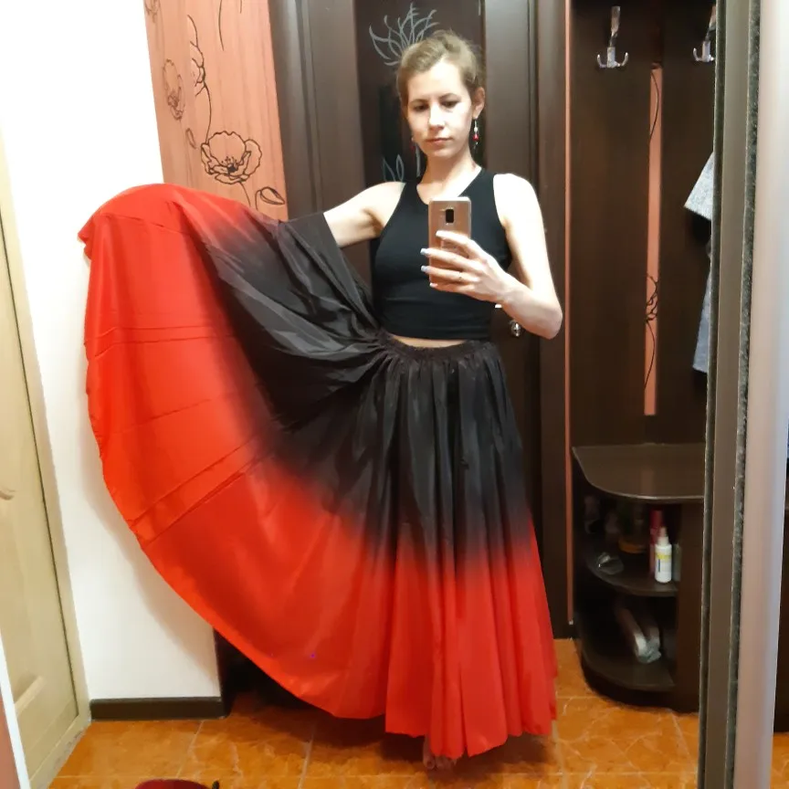 Эта юбка не для фламенко. Качество ткани плохое (сплошная синтетика липнет к ногам). Цвет в градиент не доходит до черного, останавливается на грязно-красном. За такие деньги уже можно смотреть в Испании.