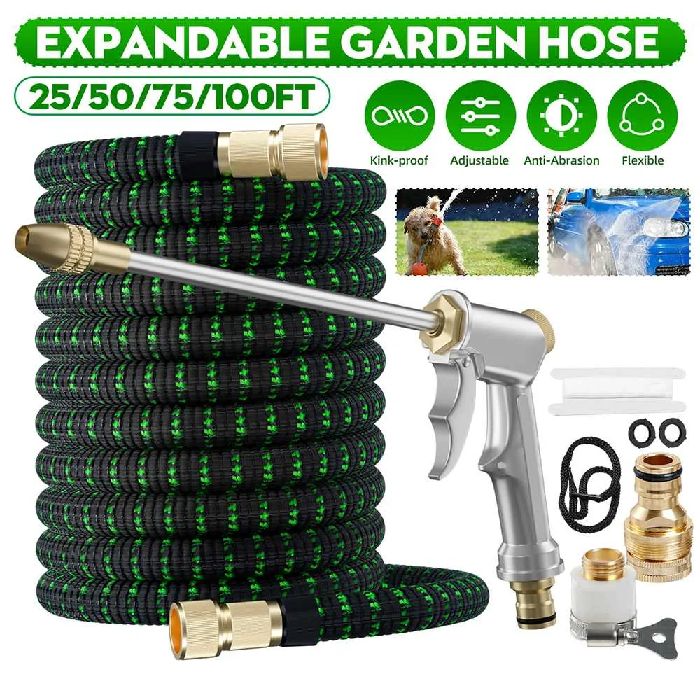 Особенности товара:Название продукта: расширяемый садовый шлангМатериал: латекс + ТЭП + пластик + медьЦвет: черный + зеленыйМатериал ручки: сплавG un материал головки: медьРасширяется шланг: до 3 раз по длинеДлина: 7,5 m(25ft)/15 м (50ft)/22,5 м (75ft)/возможностью погружения на глубину до 30 м (100ft)Особенности: защита от катышков/Регулируемая/анти-истирание/гибкая/мягкаяПрименимые случаи: подходит для полива и очистки: сад, автомойка, RV, бассейн, лодка и так далее