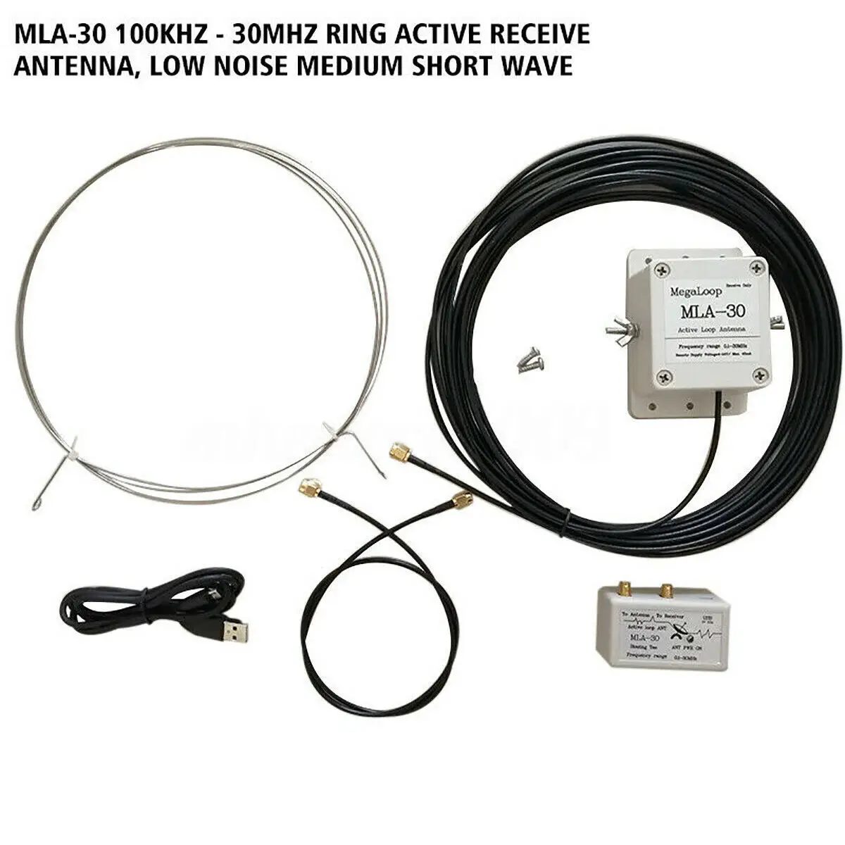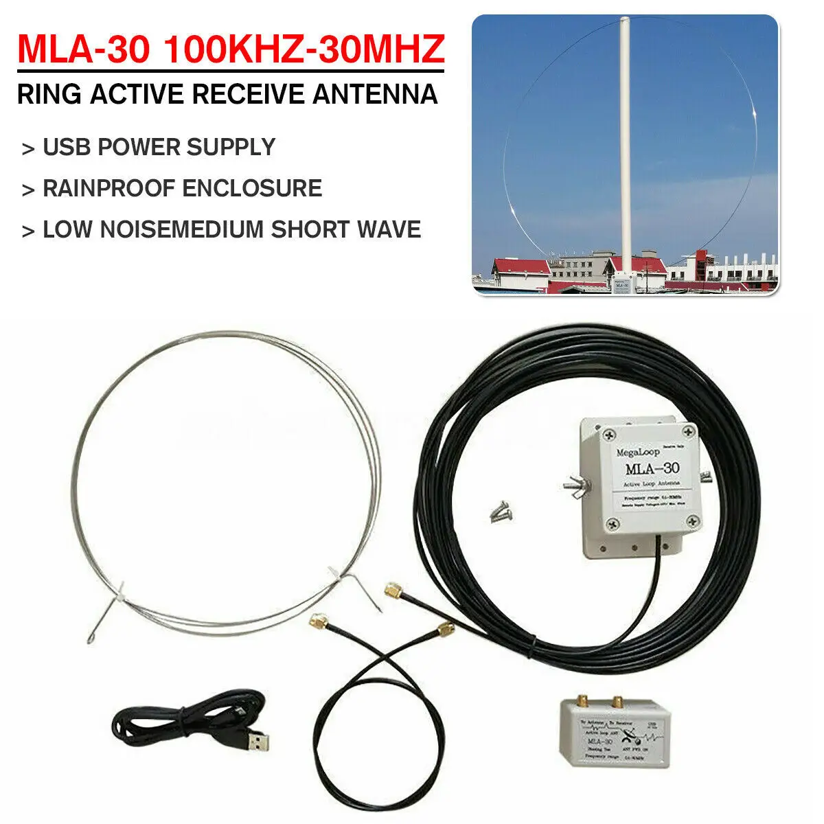MLA-30 антенна-это популярная широкополосная антенна. Это эффективная антенна для коротковолновых слушателей (SWL) и любительских радиолюбителей (HAM) для получения средних и коротковолновых в ограниченных жилых районах. Частота охватывает от 100 кГц до 30 МГц. Превосходная направленность может помочь уменьшить шум и улучшить отношение SNR, и может выкопать слабые сигналы, которые перегружены шумом при получении обычных антенн. MLA-30 антенна может быть легко установлена на балконах, крышах и других местах, с компактным размером. Еще одним преимуществом MLA-30 петли антенны является то, что она направленная. Вращая антенну, Манекен антенны выровнен с сигналом помех, так что конкретные помехи ближнего поля могут быть сведены к минимуму.