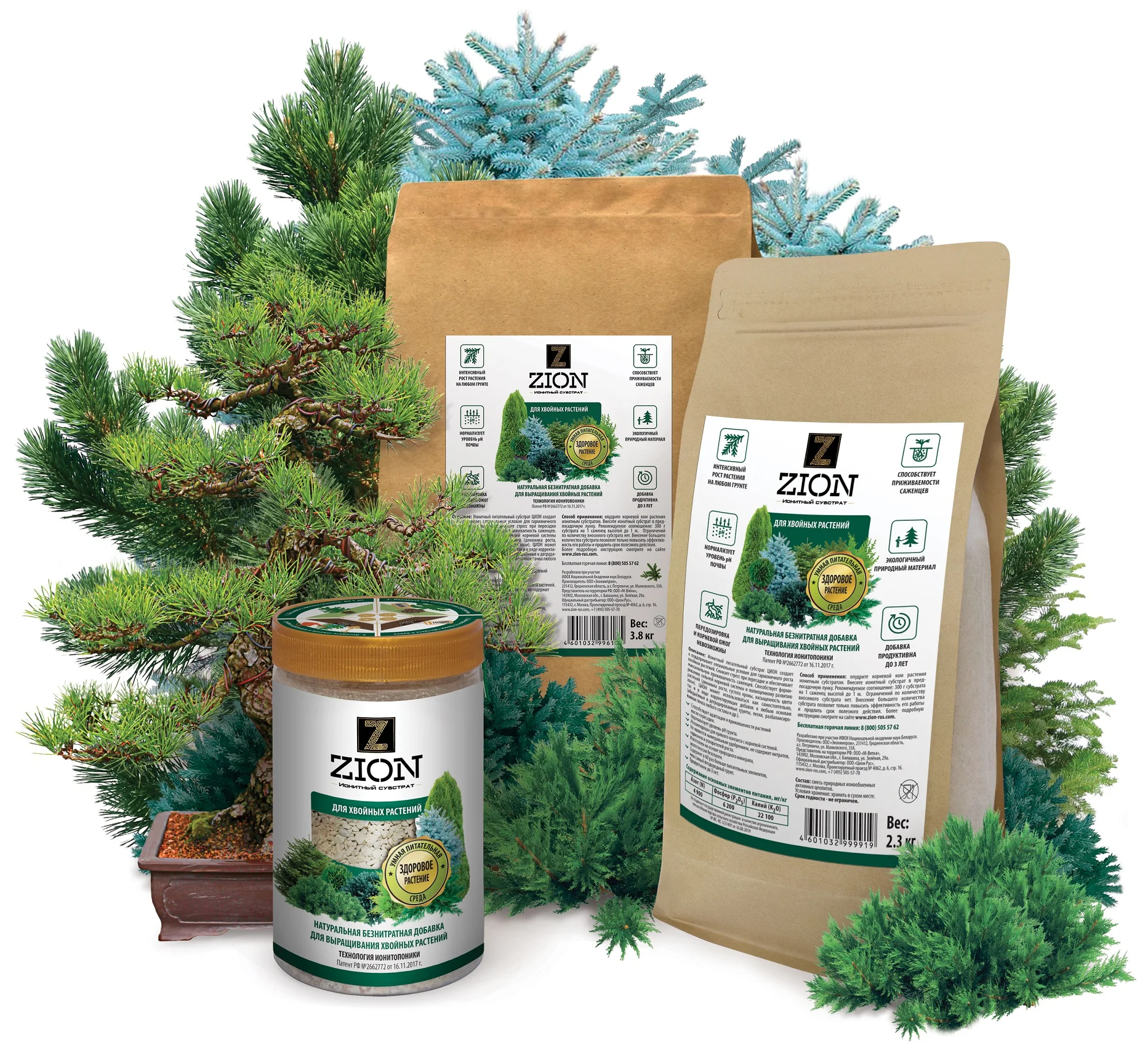 Подходит для выращивания любых хвойных растений.Крафтовый мешок 2,3 кг.Рассчитан на объем 75 литров грунта.Ионитный питательный субстрат ЦИОН ДЛЯ ХВОЙНЫХ РАСТЕНИЙ создает и поддерживает оптимальные условия для роста и полноценного развития хвойных деревьев и кустарников. Способствует формированию сильной корневой системы и полноценному развитию растений (динамика роста, густота кроны, насыщенность цвета хвои). Ионитный субстрат ЦИОН ДЛЯ ХВОЙНЫХ РАСТЕНИЙ может быть использован для обеспечения растения сбалансированным набором элементов питания на любом этапе его жизненного цикла. В течение периода полезного действия ЦИОНа никаких дополнительных подкормок растению не потребуется.- Нормализует уровень рН грунта.- Снижает стресс при пересадке.- Обеспечивает максимальную приживаемость саженцев.- Рекомендован для прямого контакта с корневой системой. Изготовлен на основе природного минерала, экологически безопасен.- Не является минеральным удобрением, не содержит нитратов, гормонов, пестицидов, гербицидов и ускорителей роста.- Содержит в 60 раз больше питательных элементов, чем самый плодородный грунт. Продуктивен до 3 лет.СПОСОБЫ ПРИМЕНЕНИЯ:При посадке саженцев: опудрите корневой ком растения ЦИОНом. Внесите ЦИОН в посадочную яму под корень саженца из расчета 30-60 г субстрата на 1 л корневого кома растения. Например, при посадке юного растения туи из 0,5 л необходимо внести 15-30 г субстрата. А при посадке подрощенной туи из 2-х литрового контейнера необходимо внести 60-120 г ЦИОНа.Для подкормки растущих хвойных растений: по периметру приствольного круга растения вращательными движениями острым предметом сделайте проколы глубиной 30-40 см под наклоном 45 градусов, стараясь не повредить корневую систему. В образовавшиеся ямки внесите субстрат ЦИОН и присыпьте землёй. Расход ЦИОНа для подкормки растущих хвойных растений зависит от возраста и размера растения. Например, для саженца высотой до 1 м расход ЦИОН - 300-400 г, для саженца высотой от 1 до 2,5 м - 700-1000 г, а при подкормке взрослых деревьев выше 2,5 м - 1,5-2,0 кг на каждое дерево. Подкормку можно производить в течение всего садового сезона до наступления заморозков.Ограничений по количеству вносимого субстрата нет. Внесение большего количества субстрата позволит только повысить эффективность его работы и продлить срок полезного действия.