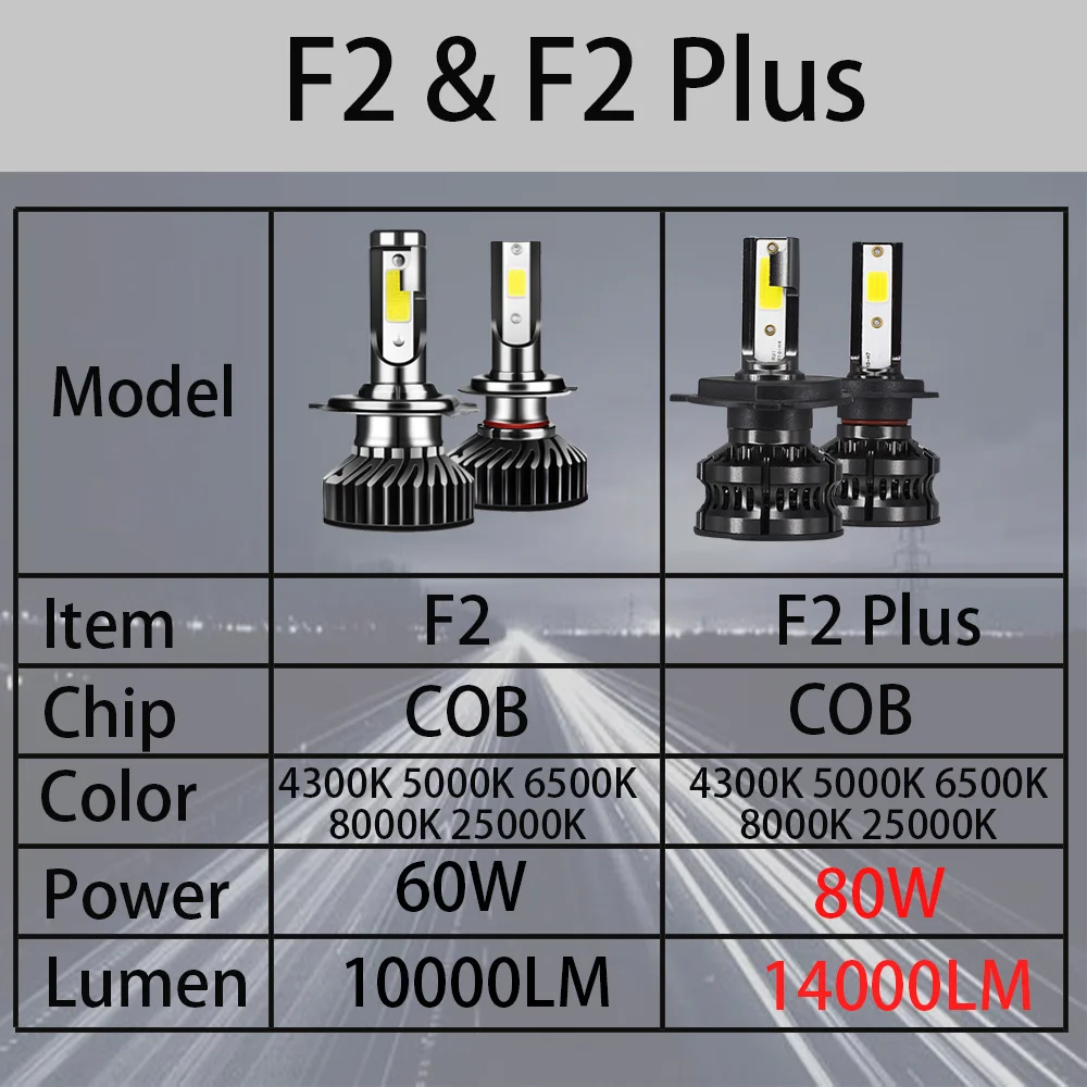 Цена включает 2 комплекта F2 : 60 Вт 10000LM/пара F2 Plus : 80 Вт 14000LM/пара Для некоторых специальных автомобилей, если лампочка мигает или имеет сообщение об ошибке, Требуется дополнительный декодер canbus, для большинства автомобилей он не нужен