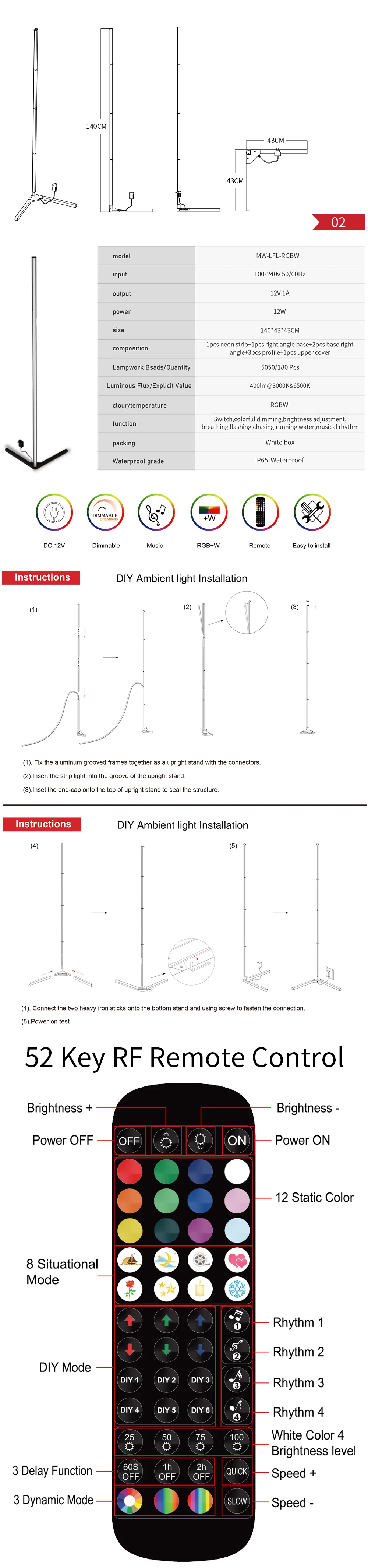 Напряжение: DC12A 1AМощность: 12 ВтРазмер: 140 см * 43 см * 43 смЛэмпворк bsads/Количество: 5050/180 штСветовой поток: 400 лмClour/температура: RGBW (холодный белый + теплый белый)Водонепроницаемый класс: IP65 Водонепроницаемый (силиконовый светильник полосы: лучше светильник с высоким коэффициентом пропускания!)Funcion: переключатель/красочное Затемнение/регулировка яркости/дыхание мигает/чеканка/бегущая вода/музыкальный ритм.Управление режим: 52-ключ дистанционный пульт Управление/Bluetooth + дистанционный пульт Управление/WI-FI + дистанционный пульт УправлениеПульт дистанционного управления не содержит батареек! (Модель батареи кнопки: CR2025!)