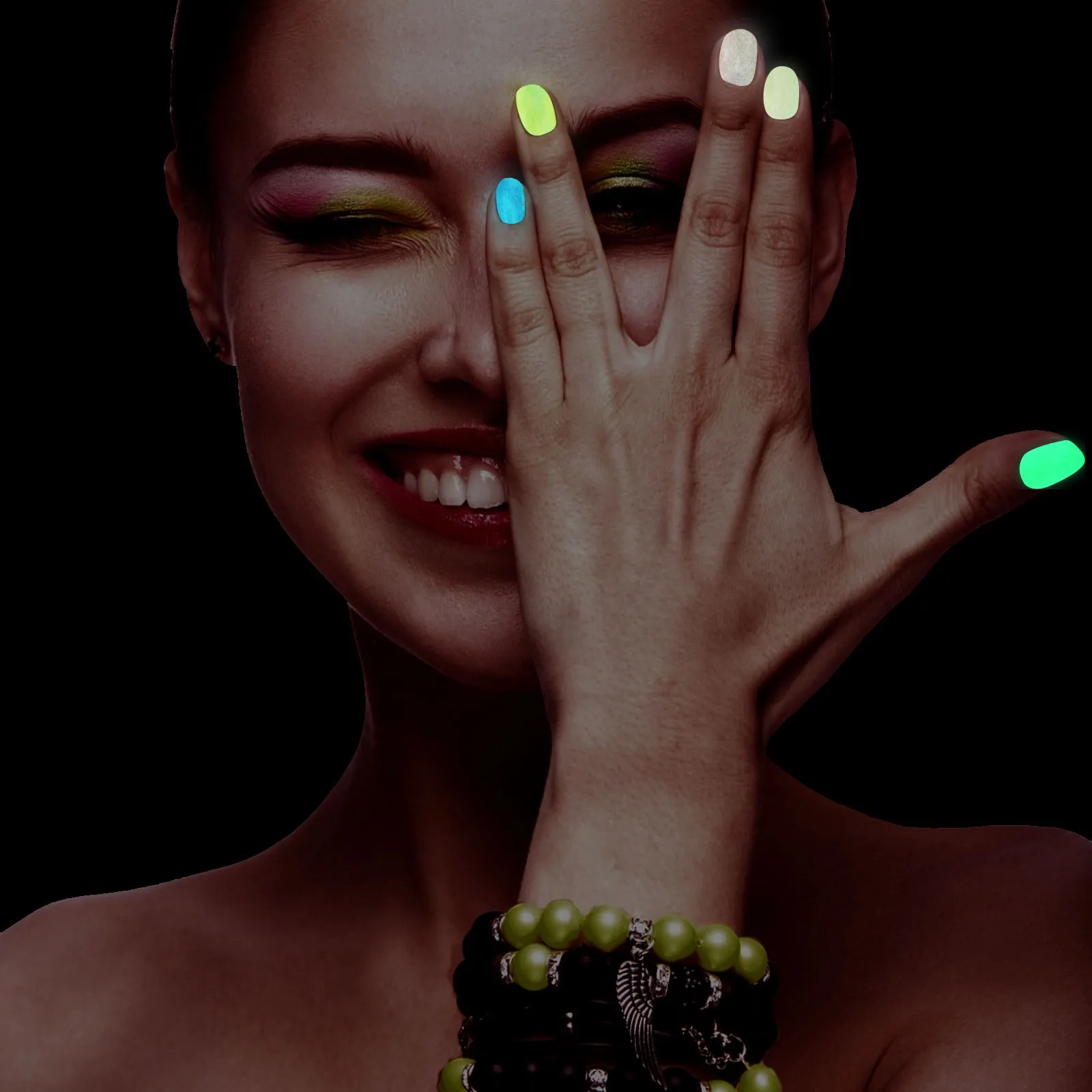 Светится в темноте: Этот светится в темноте порошок для ногтей представляет собой яркий пигментный порошок, который светится в темноте в обычное дневное время. Ночью они могут быть еще ярче, если днем они поглощают больше солнечного света. Порошки для творчества ногтей: красочные порошки для ногтей подходят для ногтей из УФ-геля, акриловых ногтей, натуральных ногтей, неоновых градиентных ногтей, голографических блестящих эффектов и многого другого.