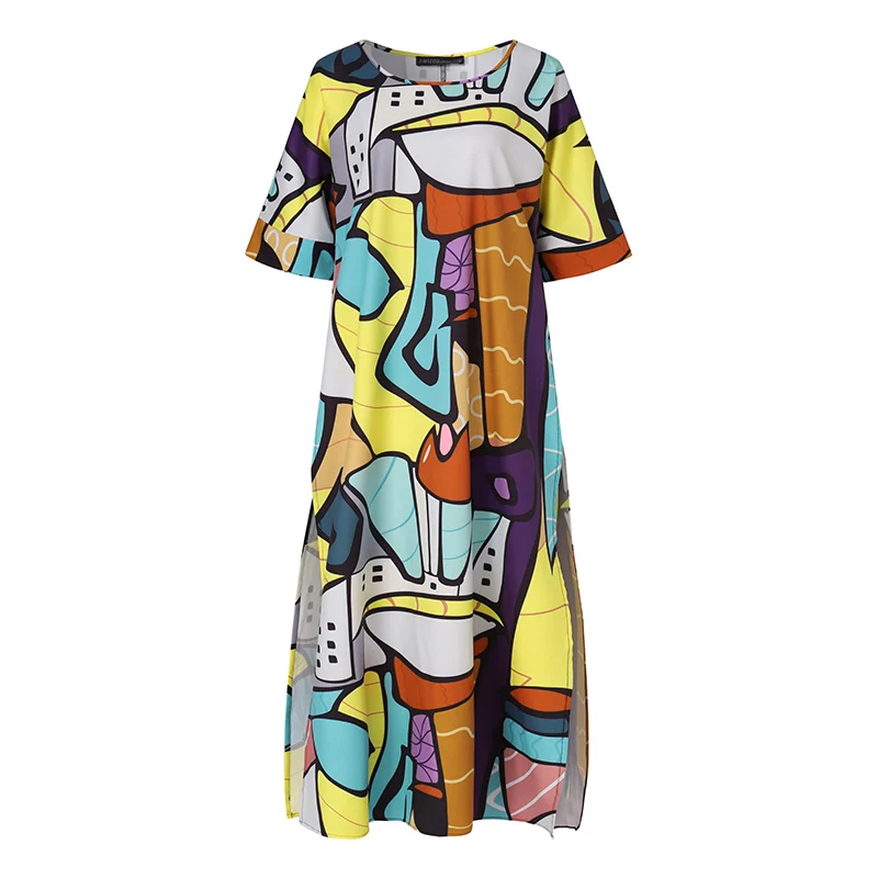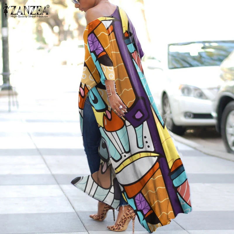 Мешковатые рабочие блузы, женские летние длинные топы с принтом ZANZEA, богемная Цветочная блузка с коротким рукавом, Повседневная рубашка с круглым вырезом и разрезом на подоле для женщин