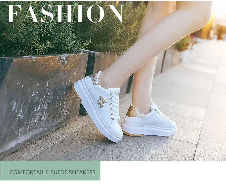 Женская маленькая белая обувь с вышивкой пчела, женская спортивная обувь для скейтбординга, мягкая обувь из искусственной кожи на платформе, стразы, кроссовки