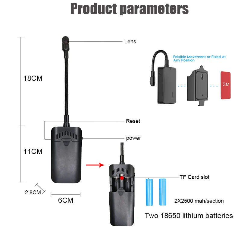 Особенности продукта:3 м поддержка, без отверстия, Портативная установка360 градусов свободное вращение объектива, может быть помещено в любой угол, не нужно беспокоиться о угол обзораДве съемные аккумуляторные батареи 18650 с питанием длительностью около 24 часов7/24 часов непрерывной зарядки непрерывной работы видеоWIFI, дистанционное управление мобильным приложениемДо 128 ГБ для хранения видео в течение ПолумесяцаОсобенности:** Батарея WIFI мини-камера** Вращающийся на 360 градусов кронштейн** Разрешение видео 1080P HD** Циклическая запись, обнаружение движения и сигнализация** Пульт дистанционного управления для смартфона в приложении** Простота установки и подключения** Micro-SD карта до 128 ГБ** 5000 мАч, срок службы батареи 24 рабочих** 7/24 часов работы во время зарядки