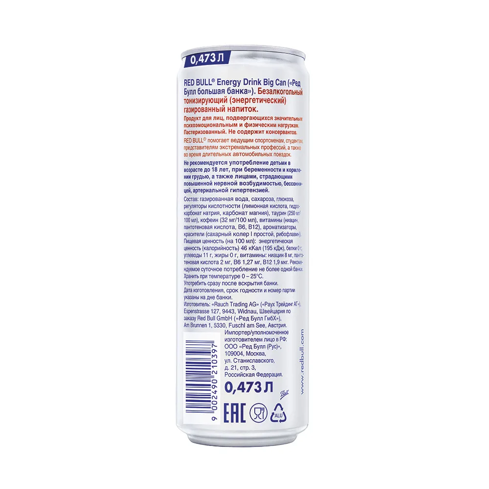 Энергетический Напиток Red Bull-это безалкогольный газированный напиток. В состав входит ряд высококачественных ингредиентов: вода из альпийских регионов, кофеин, который повышает умственную и физическую активность, таурин, который стимулирует работу сердца и сердца. Обеспечение энергетического метаболизма в организме. Red Bull помогает ведущим спортсменам, студентам, представителей различных профессий, а также во время длительных поездок на автомобиле. Банки Red Bull изготовлены из 100% переработанного алюминия.