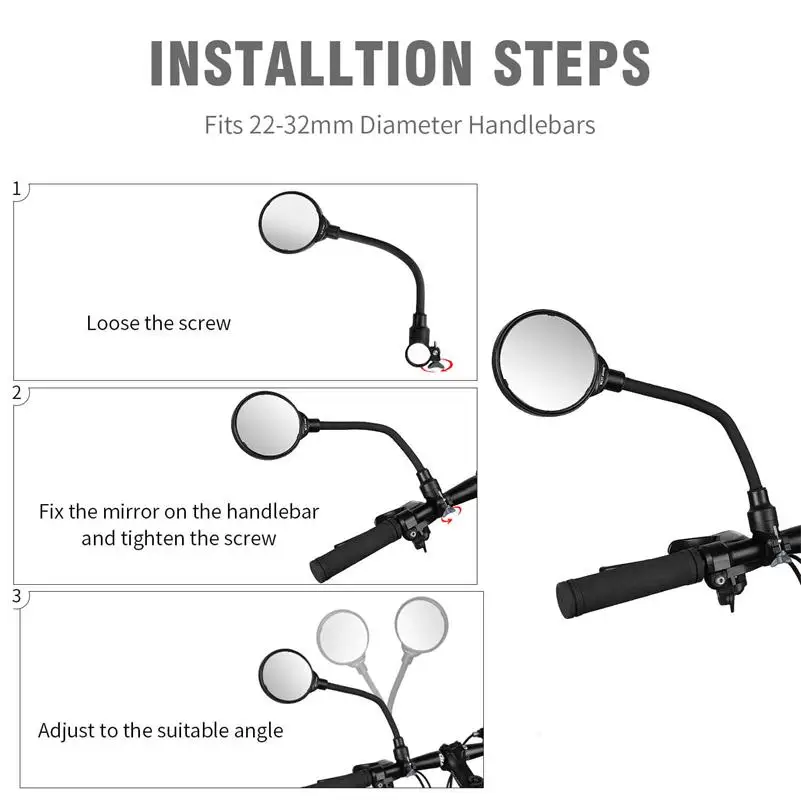 1: зеркало выпуклое, широкое поле зрения2: непосредственно устанавливается на все виды рулей велосипеда электрический велосипед или тиски ручки, без дополнительных аксессуаров3: после установки, тело или рука могут блокировать линию зрения при езде, и вам нужно встряхнуть спереди, чтобы отрегулировать угол зеркала, когда вы хотите смотреть его.