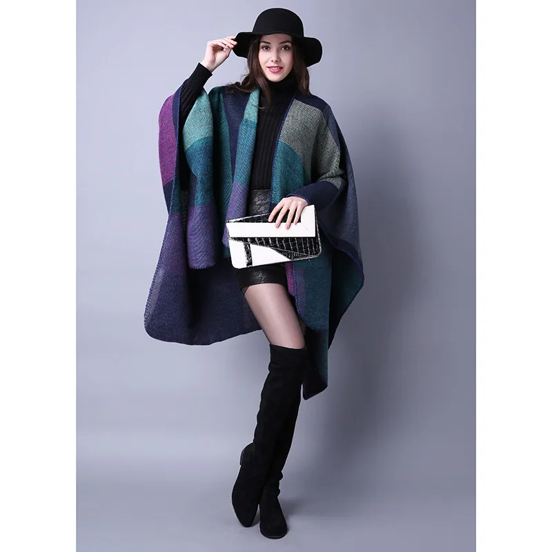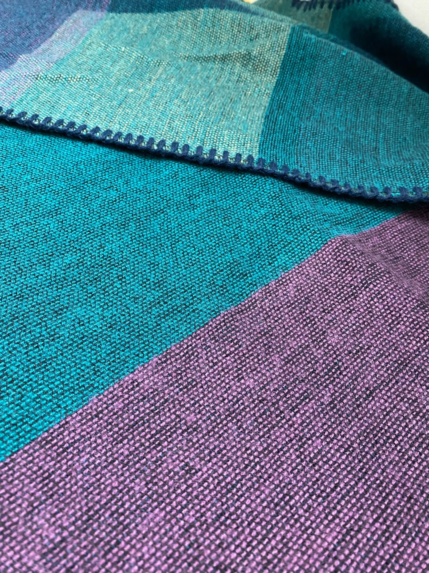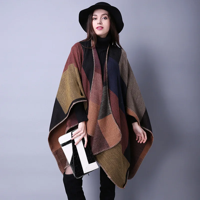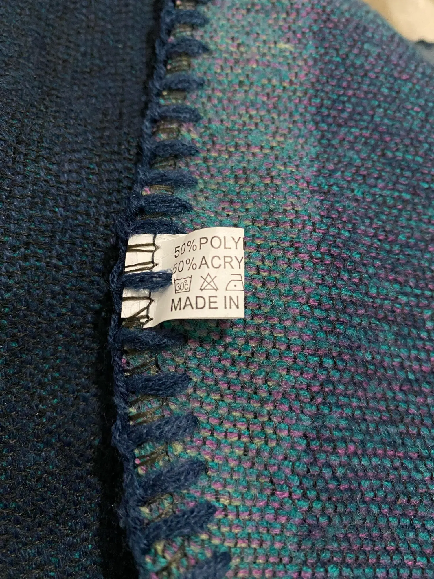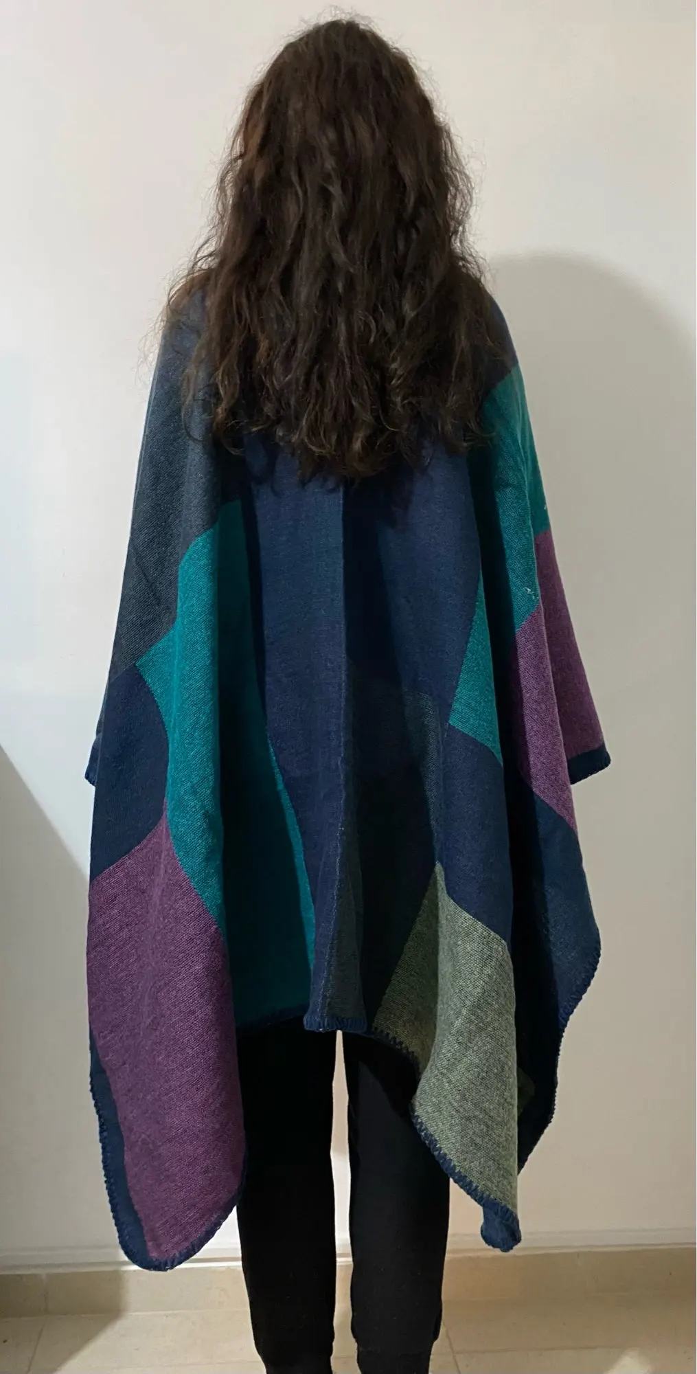 Яркое, но тонкое пончо. Ожидала, что будет раза в 2 толще, чтобы на работе накидывать зимой. По факту же пончо тонковато, только для осени. Но цвета очень сочные и яркие. Состав - 50% полиэстера, 50% акрила, ни о каком кашемире/шерсти и речи не идет. Окантовка двойная - обычный оверлок + поверх крупная обвязка по краю.