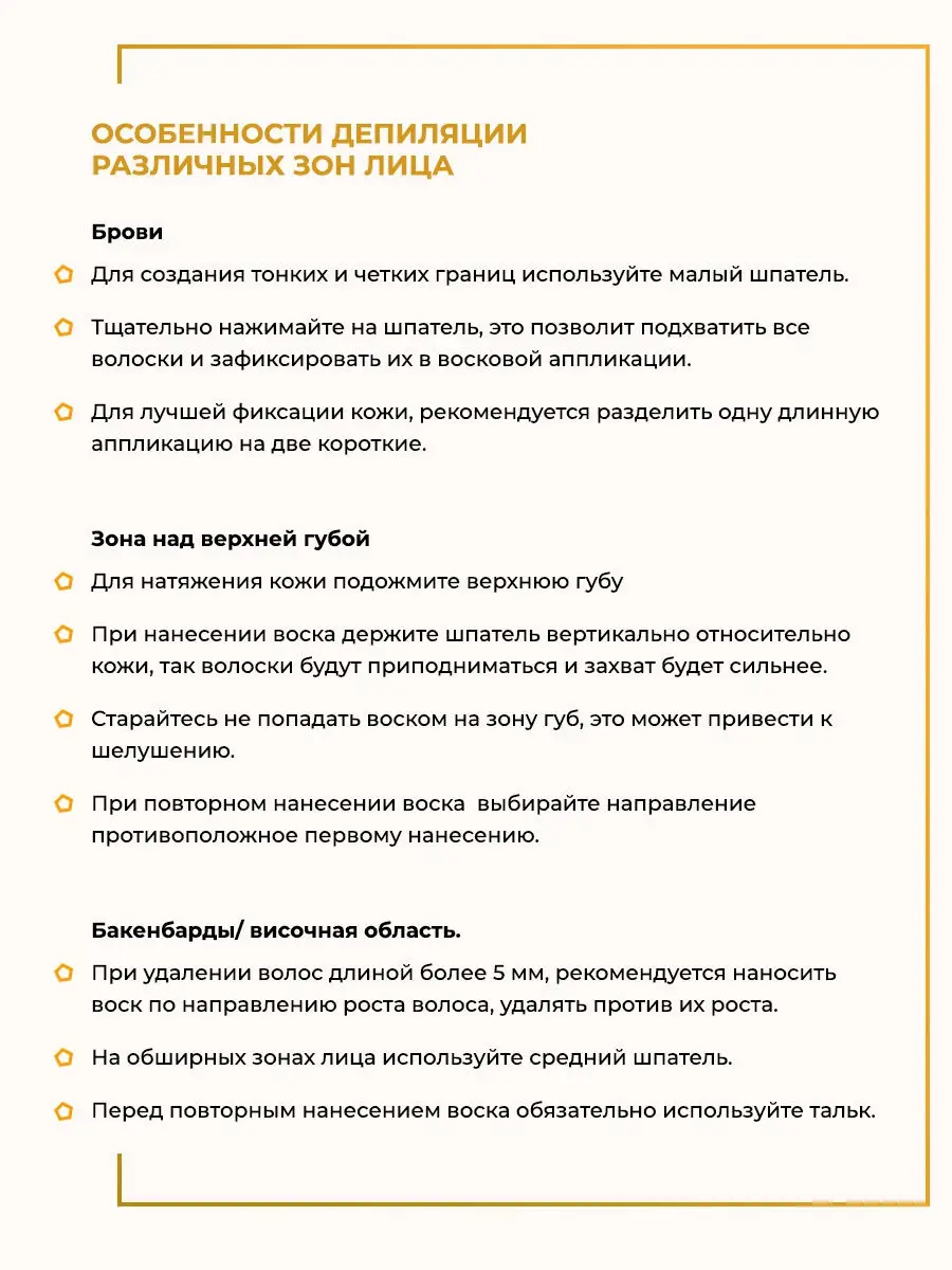 Способ применения: Брови: • Для создания тонких и четких границ используйте малый шпатель. • Тщательно нажимайте на шпатель, это позволит подхватить все волоски и зафиксировать их в восковой аппликации. • Для лучшей фиксации кожи, рекомендуется разделить одну длинную аппликацию на две короткие. Зона над верхней губой: • Для натяжения кожи подожмите верхнюю губу • При нанесении воска держите шпатель вертикально относительно кожи, так волоски будут приподниматься и захват будет сильнее. • Старайтесь не попадать воском на зону губ, это может привести к шелушению. • При повторном нанесении воска выбирайте направление противоположное первому нанесению. Бакенбарды/ височная область: • При удалении волос длиной более 5 мм, рекомендуется наносить воск по направлению роста волоса, удалять против их роста. • На обширных зонах лица используйте средний шпатель. • Перед повторным нанесением воска обязательно используйте тальк. Протокол процедуры депиляции пленочными восками: 1. Разогрейте воск в нагревателе до t +38 -40°С. 2. Зону депиляции обработайте специальным лосьоном до депиляции. 3. Нанесите небольшое количество талька. 4. Возьмите шпателем необходимое количество воска и нанесите независимо от направления роста волос. Плотно прижимайте шпатель к коже, стараясь захватить все волоски. Используйте узкий шпатель. 5. Выведите конец восковой аппликации на зону с меньшим количеством волосков. 6. Приподнимите кончик аппликации над кожей, чтобы за него потом можно было ухватиться. 7. Через 5- 6 секунд убедитесь, что воск застыл. 8. Зафиксируйте кожу в месте отрыва. 9. Возьмитесь за кончик аппликации и резким движением удалите воск в направлении противоположном нанесению. 10. Повторите процедуру на следующем участке. 11. После окончания депиляции обработайте кожу успокаивающим средством.