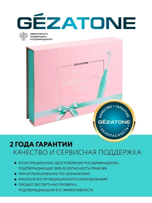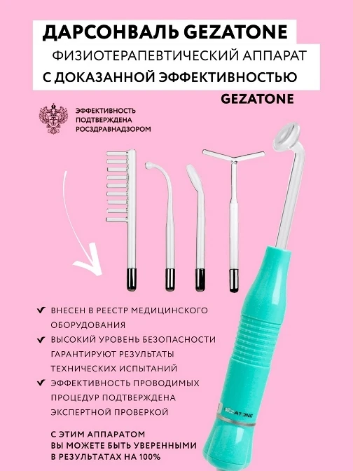Премиальная модель бренда Gezatone, Дарсонваль ВР7000, оснащенная пятью насадками-электродами, отвечает всем критериям медицинского оборудования и гарантирует безопасность проводимых процедур.