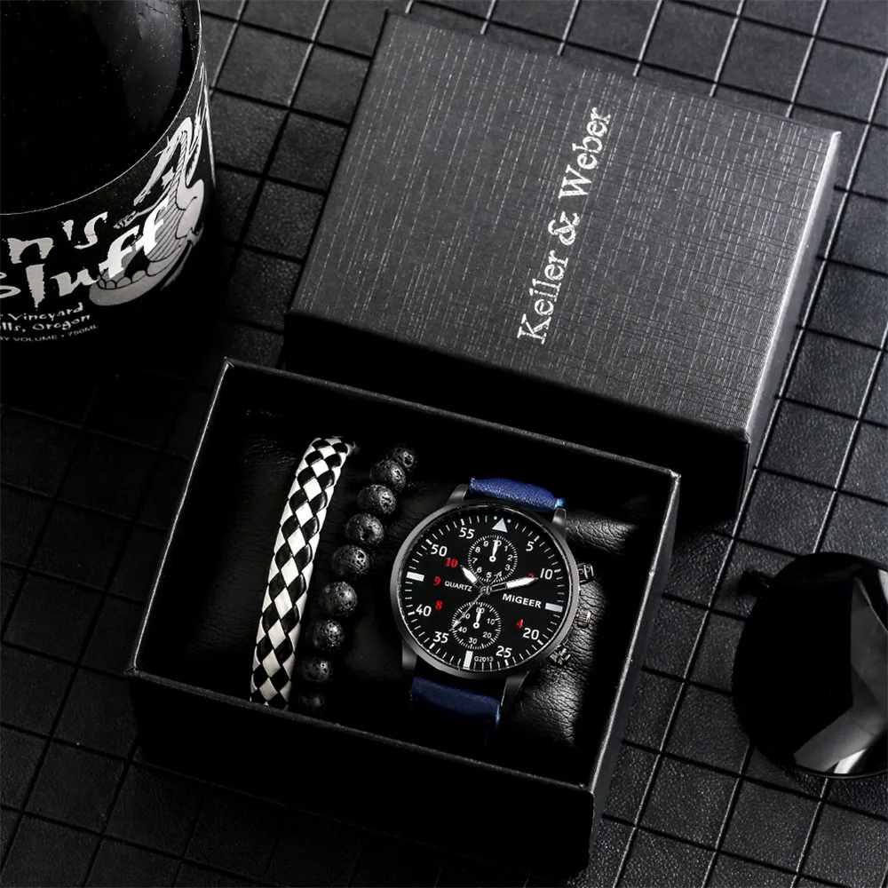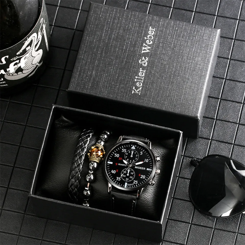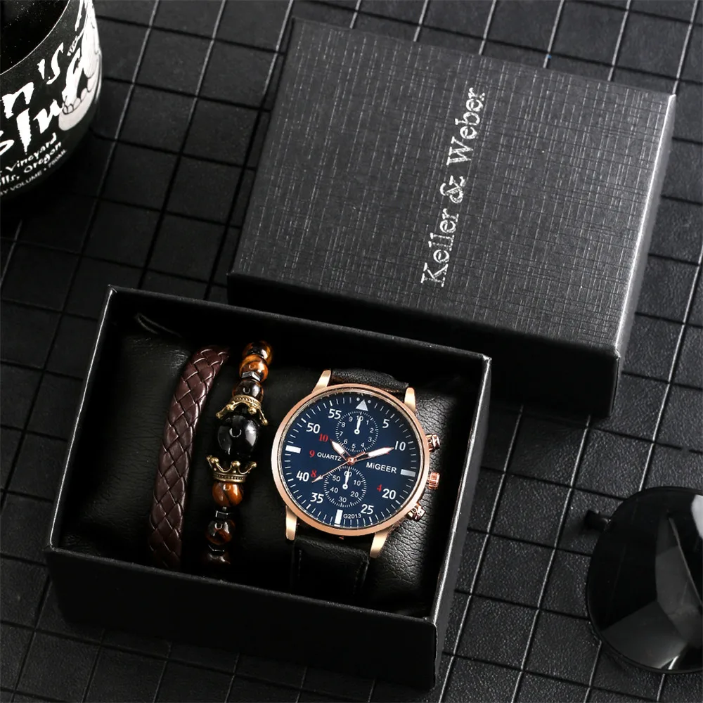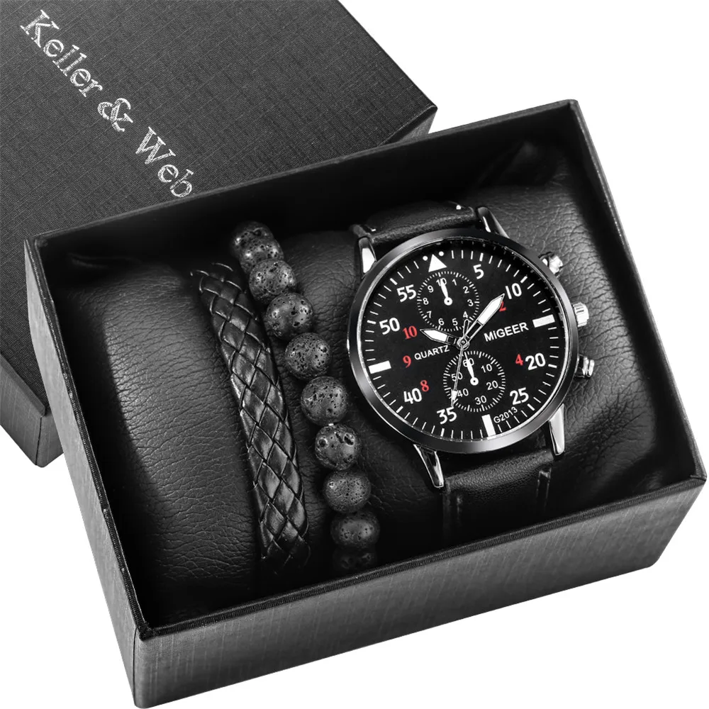 Часы Keller Weber в подарочной коробке, набор из 3 частей, кварцевые кожаные Наручные часы, модные браслеты, подарок на день рождения для сынамужадрузей