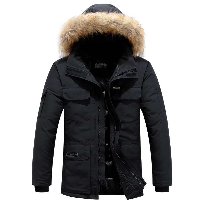 Парка мужская пуховая на белом утином пуху, с капюшоном и меховой подкладкой