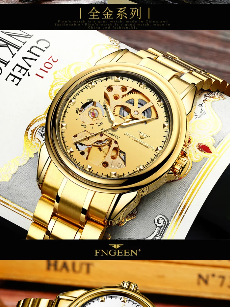 Автоматические механические часы FNGEEN 2021, модные мужские часы, роскошные полностью стальные деловые часы-скелетоны, мужские часы