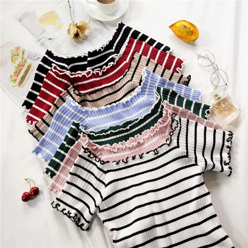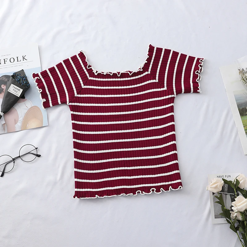Женские трикотажные футболки в полоску, футболки с коротким рукавом и воланом на подоле, футболки с открытыми плечами, женские летние футболки в стиле Харадзюку y2k, 2020