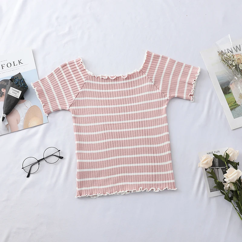 Женские футболки, вязаные полосатые футболки с открытыми плечами и воланом на подоле, женская футболка с коротким рукавом, милые укороченные топы для женщин, лето 2021, y2k