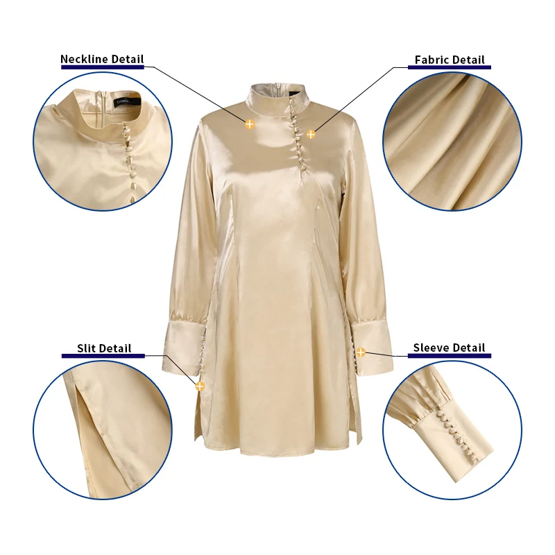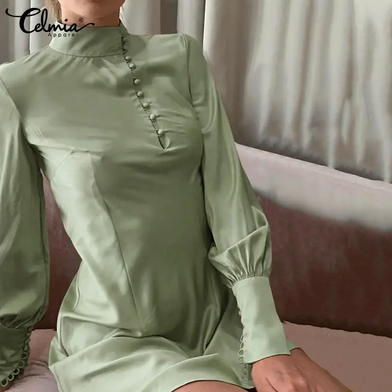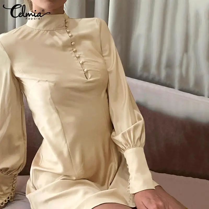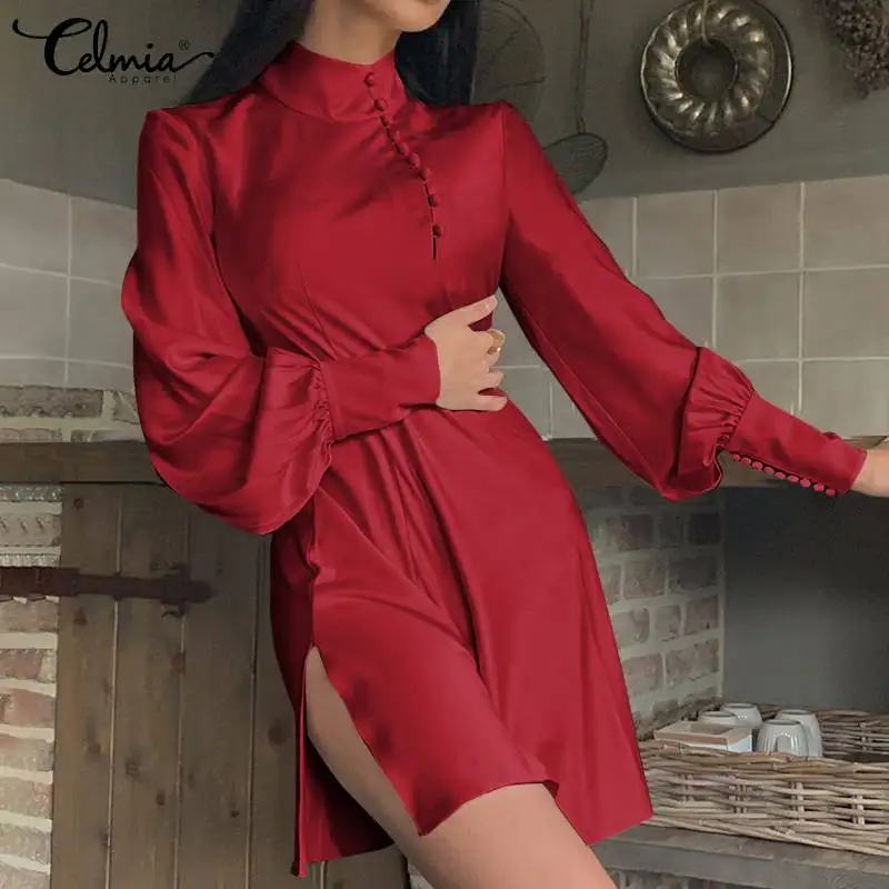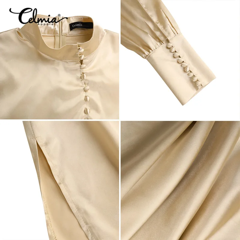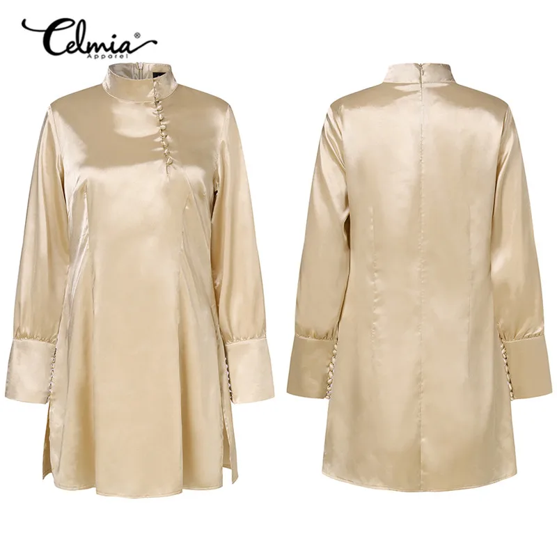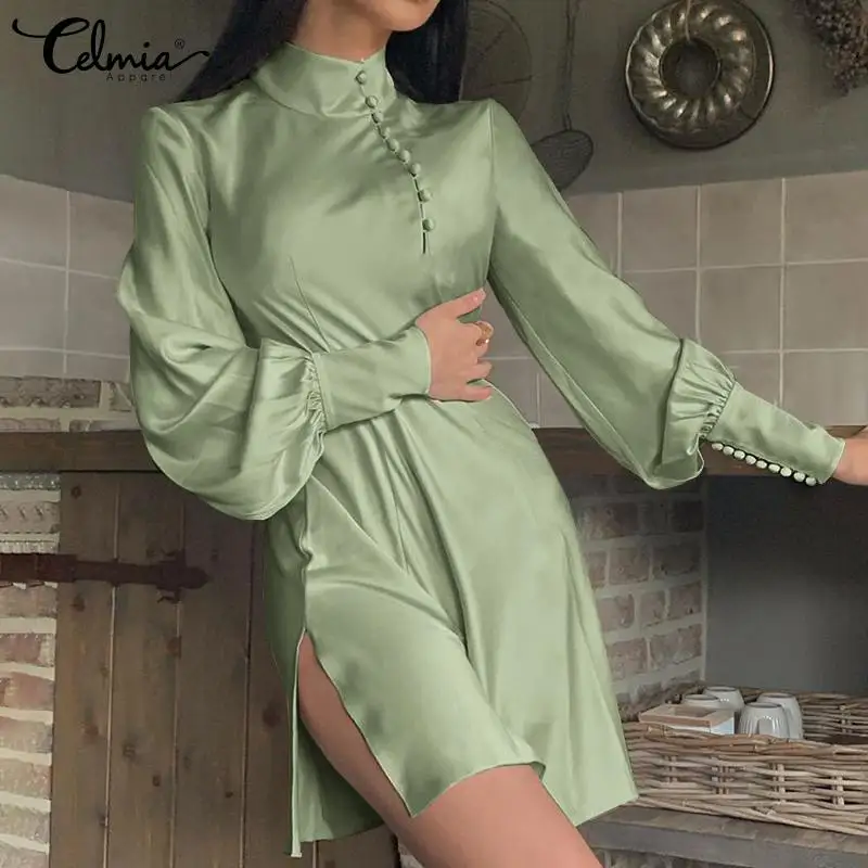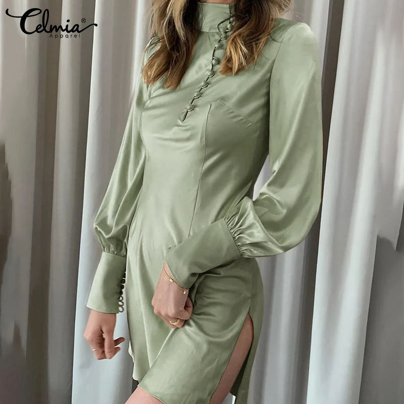 Celmia 2021 женское атласное платье с длинным рукавом, элегантный вечерний вечерние-сарафан на пуговицах с высоким воротником, Повседневная Однотонная рубашка с разрезом, платье