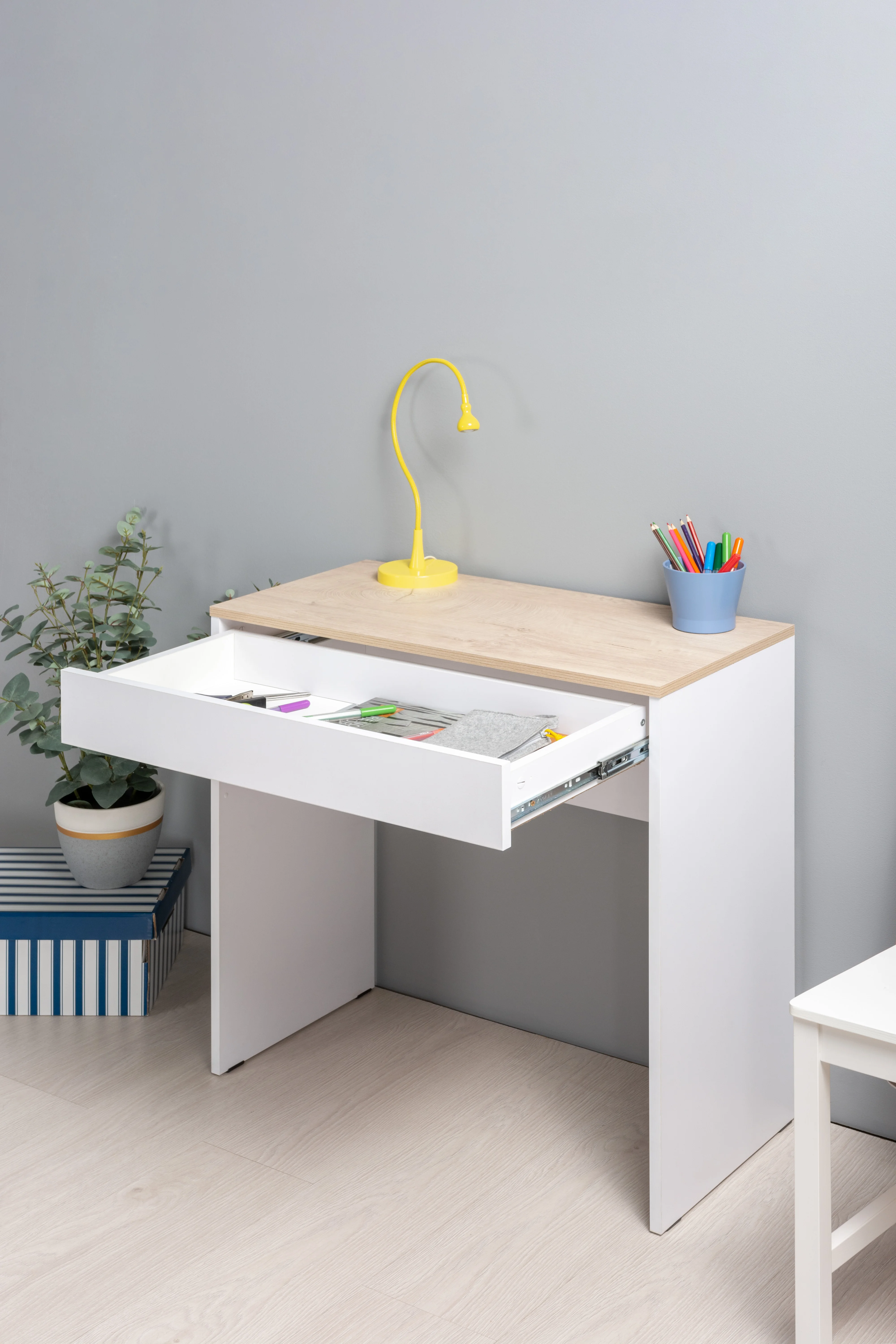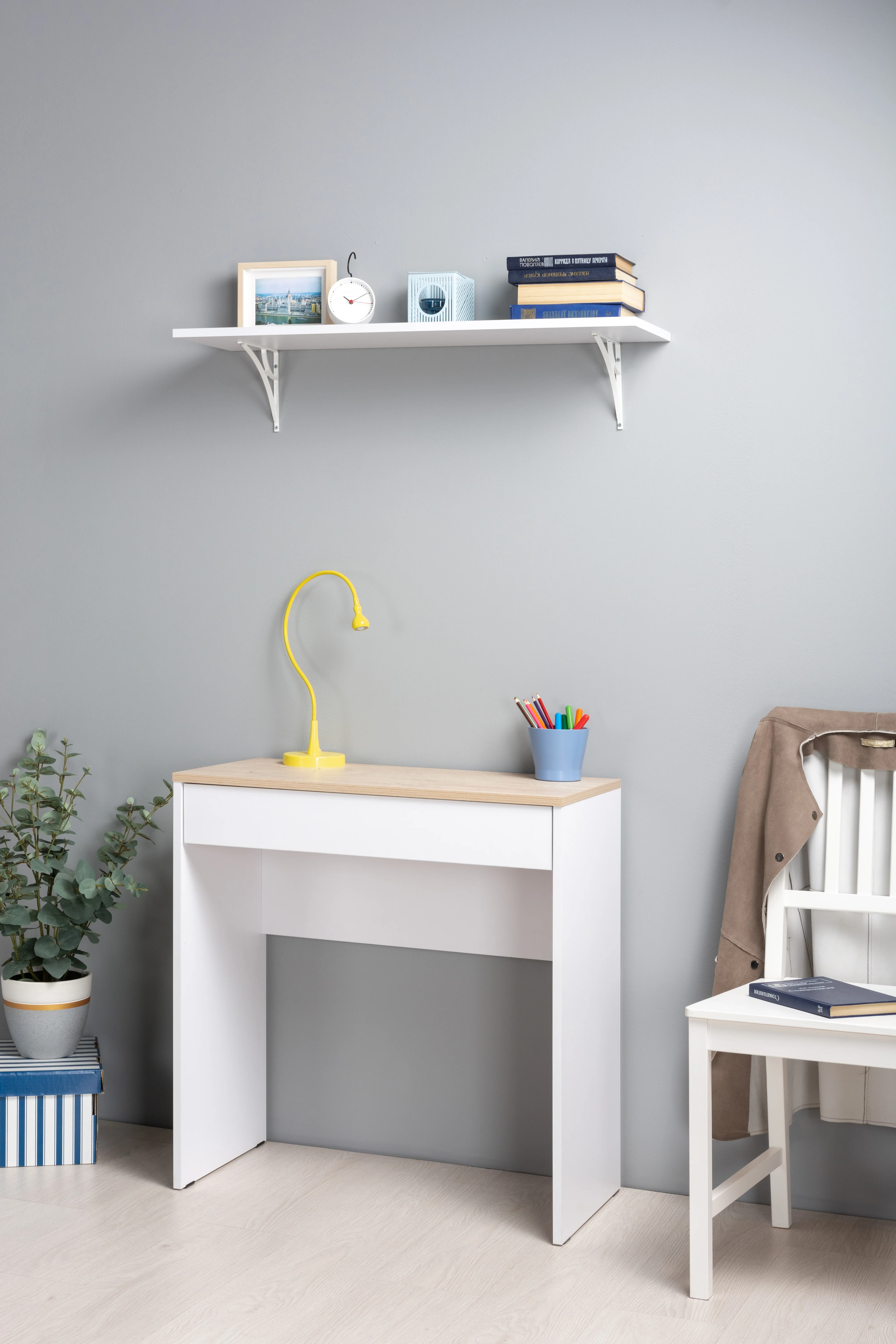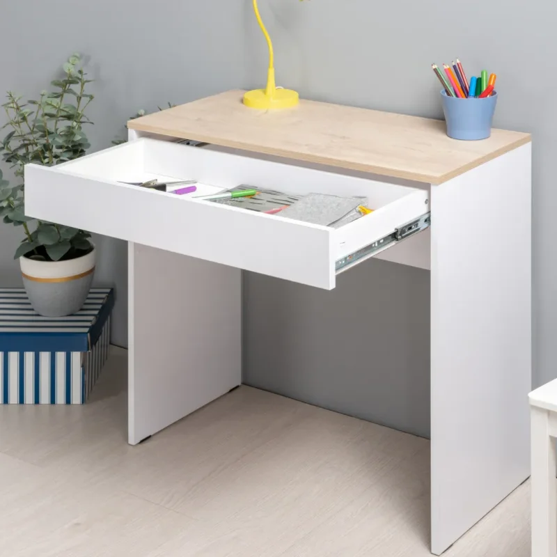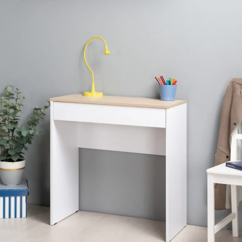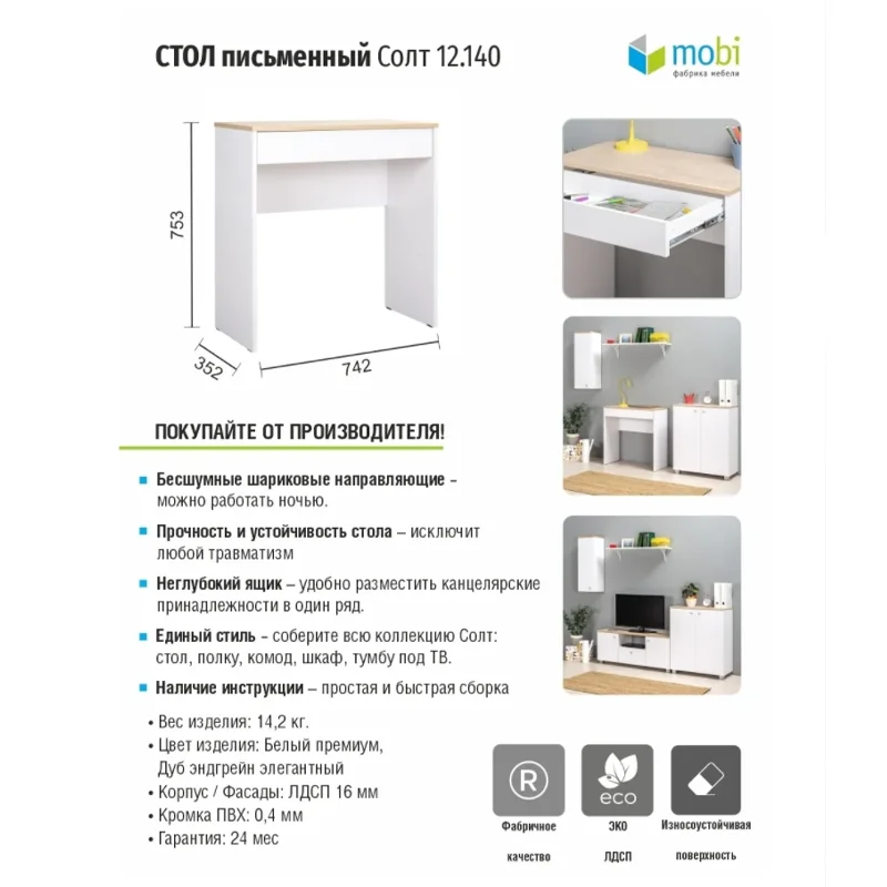 Лаконичный письменный стол Солт 12.140 позволит организовать рабочее пространство даже в небольшой комнате. Компактные размеры стола позволят Вам выбрать любое место в доме, а также использовать его, как для ноутбука, так и в качестве туалетного столика. Удачное сочетание светлых тонов будет гармонично смотреться с любой мебелью в Вашем интерьере. Изюминкой данной модели являются бесшумные направляющие выдвижного ящика. Письменный стол является частью коллекции Солт, подберите к нему полку, комод, тумбу под ТВ и навесной шкаф и создайте единый стиль в Вашей комнате. В комплекте имеются подробная инструкция по сборке, а так же, весь необходимый крепеж. По QR-коду в карточке товара Вы можете посмотреть видеоинструкцию по сборке.