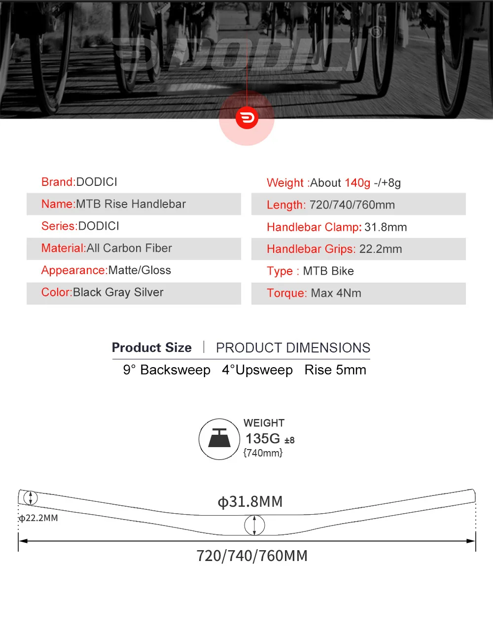 Руль для горного велосипеда DODICI из углеродного волокна, 9 градусов, 31,8*720740760 мм, матовый руль, аксессуары для горного велосипеда