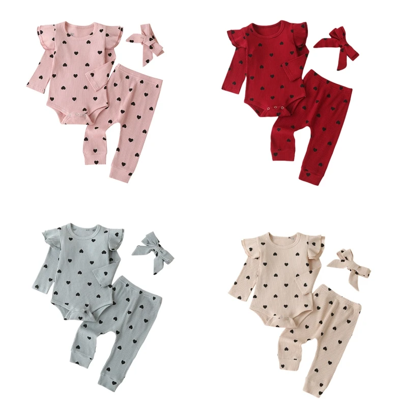 Детская повседневная одежда с длинным рукавом, с принтом в виде сердца, летние комплекты из трех предметов для малышей