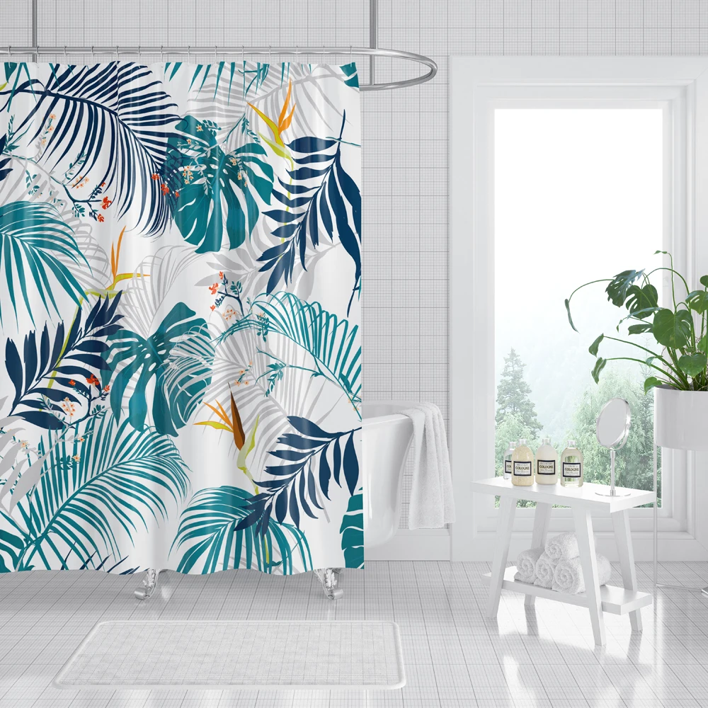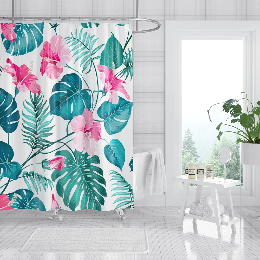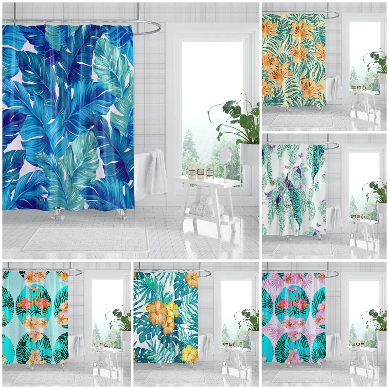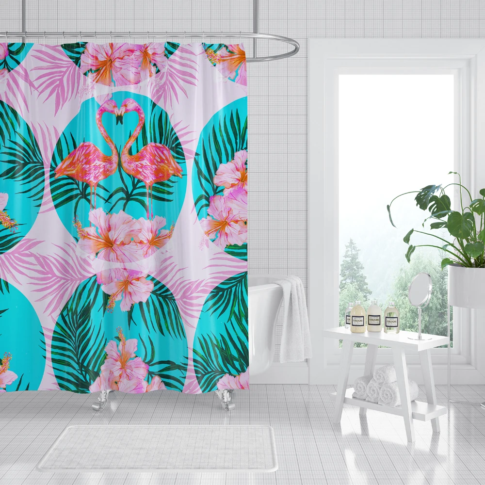 Водонепроницаемая занавеска для душа с 3D-принтом фламинго, занавеска из полиэстера с тропическими листьями, украшение для ванной комнаты с крючками