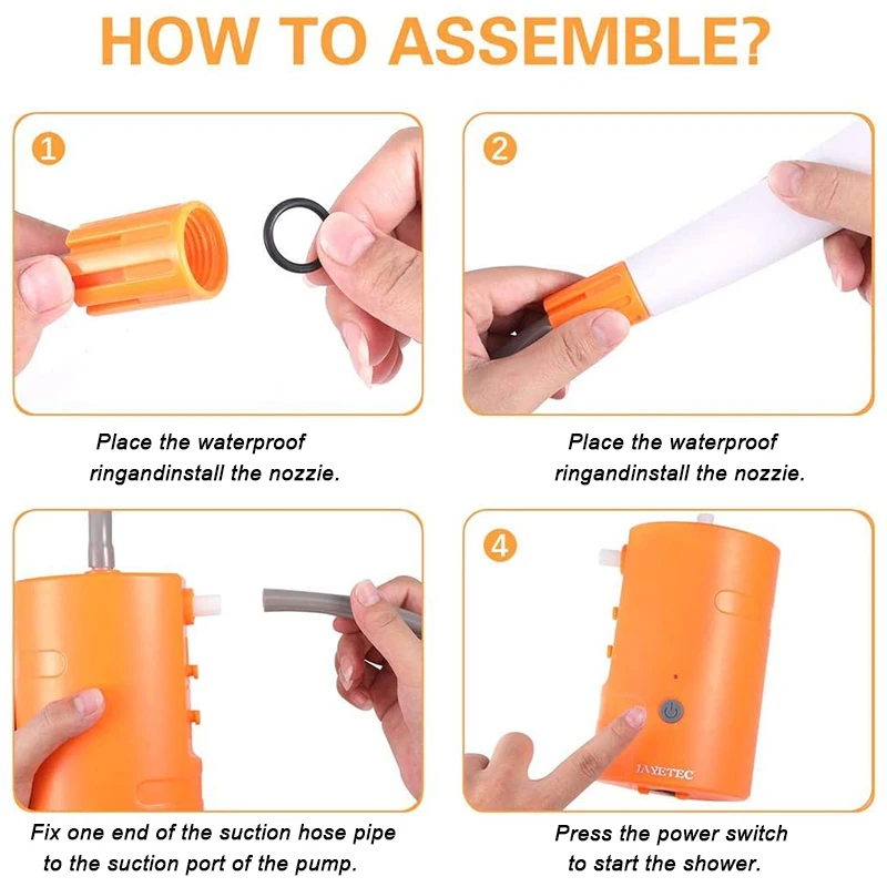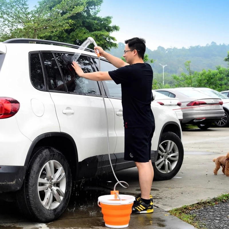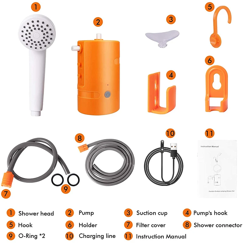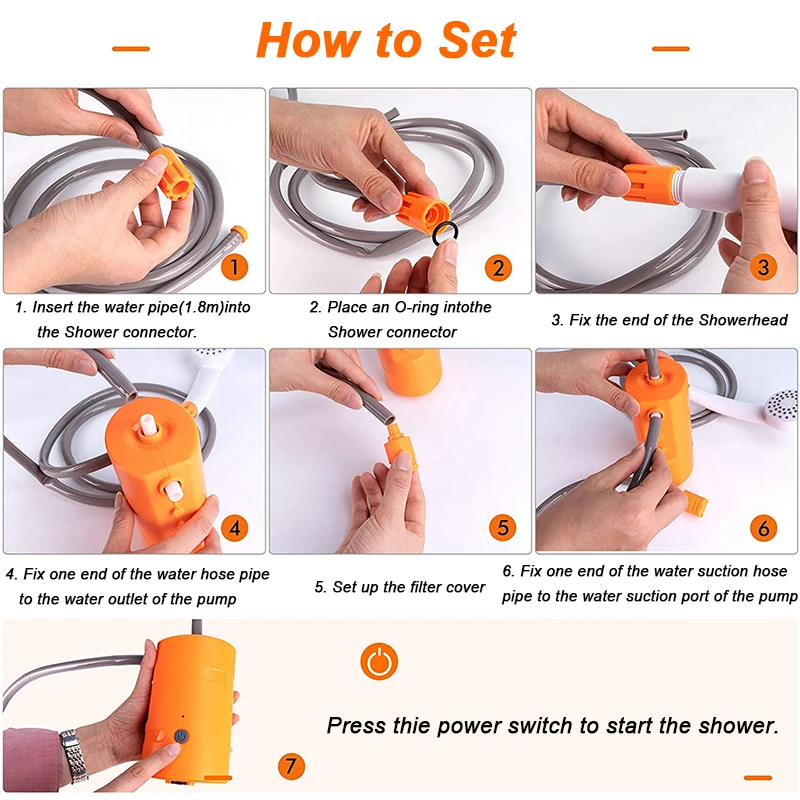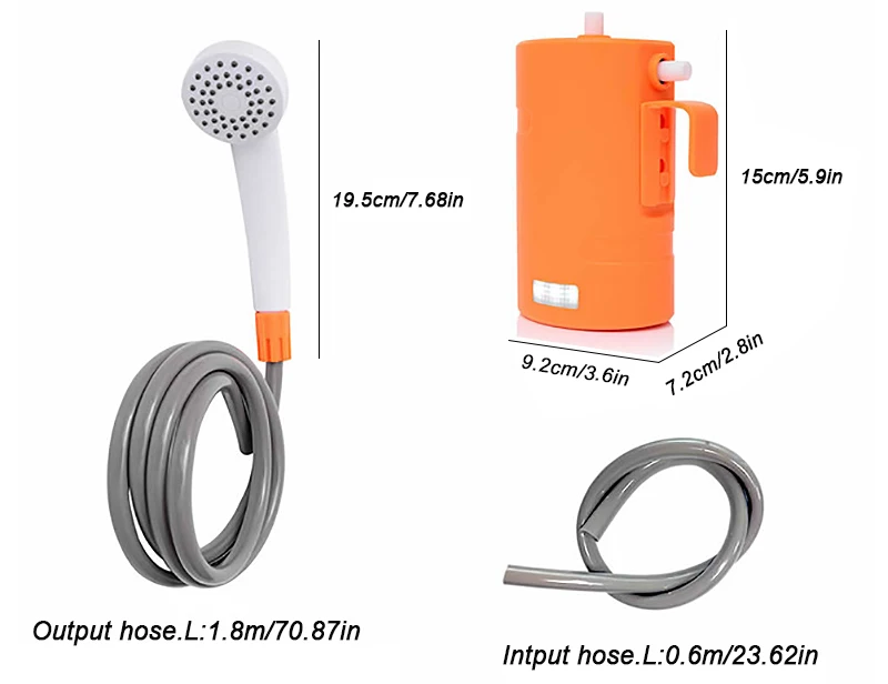 Точки пули:1. Широкое применение: С помощью этого аккумулятора мобильного душа для кемпинга с батарейным насосом вы можете принимать душ в любом месте, например, Чистка автомобиля, мытье собак, кемпинг, туризм, серфинг или другие виды деятельности. Ваш душ всегда будет с вами.2. Простота в использовании: для интегрированного погружного насоса (расход 3/4 л/мин) необходим только один источник воды (бочонок или бак с широким горлышком) для начала принятия душа. С помощью прилагаемого 3,7 V зарядный кабель, вы можете зарядить кемпинг душ с помощью любого стандартного USB-порт.3. Включая батарею: аккумуляторная батарея может работать в течение 60 минут. Открытый Душ с батарейными насосами-идеальное решение для кемпинга или путешествий. Легко соединяется с присосками или крючками.4. Мощная функция: Емкость насоса приблизительно. Длина шланга длиной 3/4 литра составляет 180 см, что не будет мешать вашему душе.5. Содержимое коробки: набор для душа для кемпинга включает 1 насадку для душа, 1 батарею, 1 кабель (USB), 1 подвеску и кронштейн и 1 присоске.
