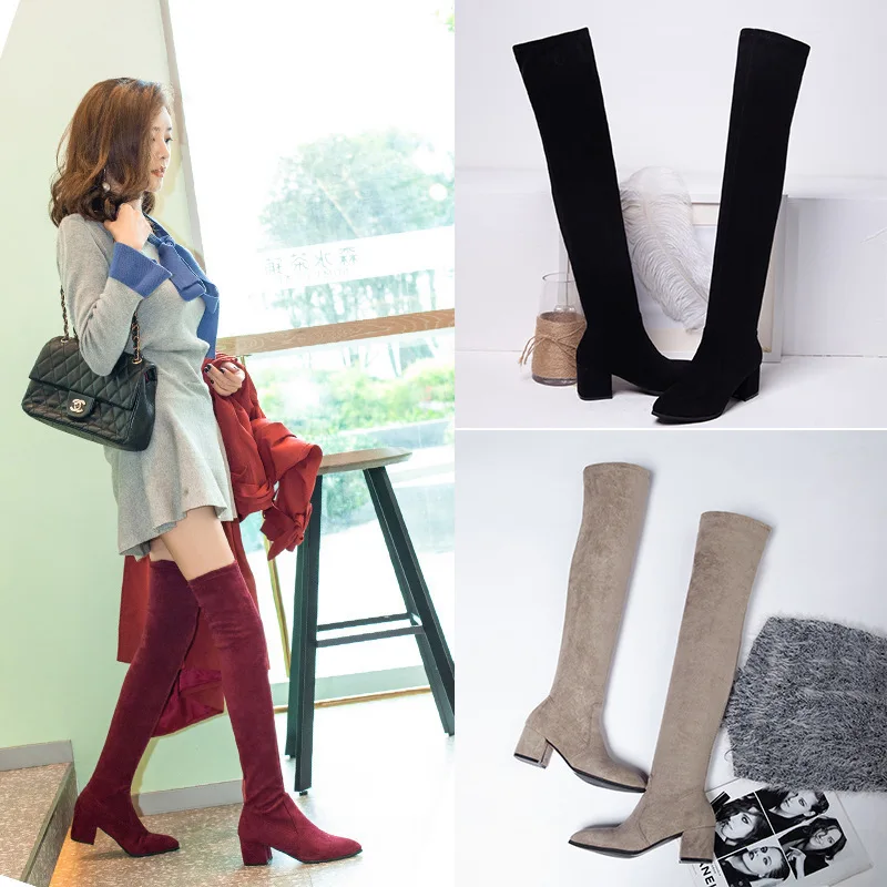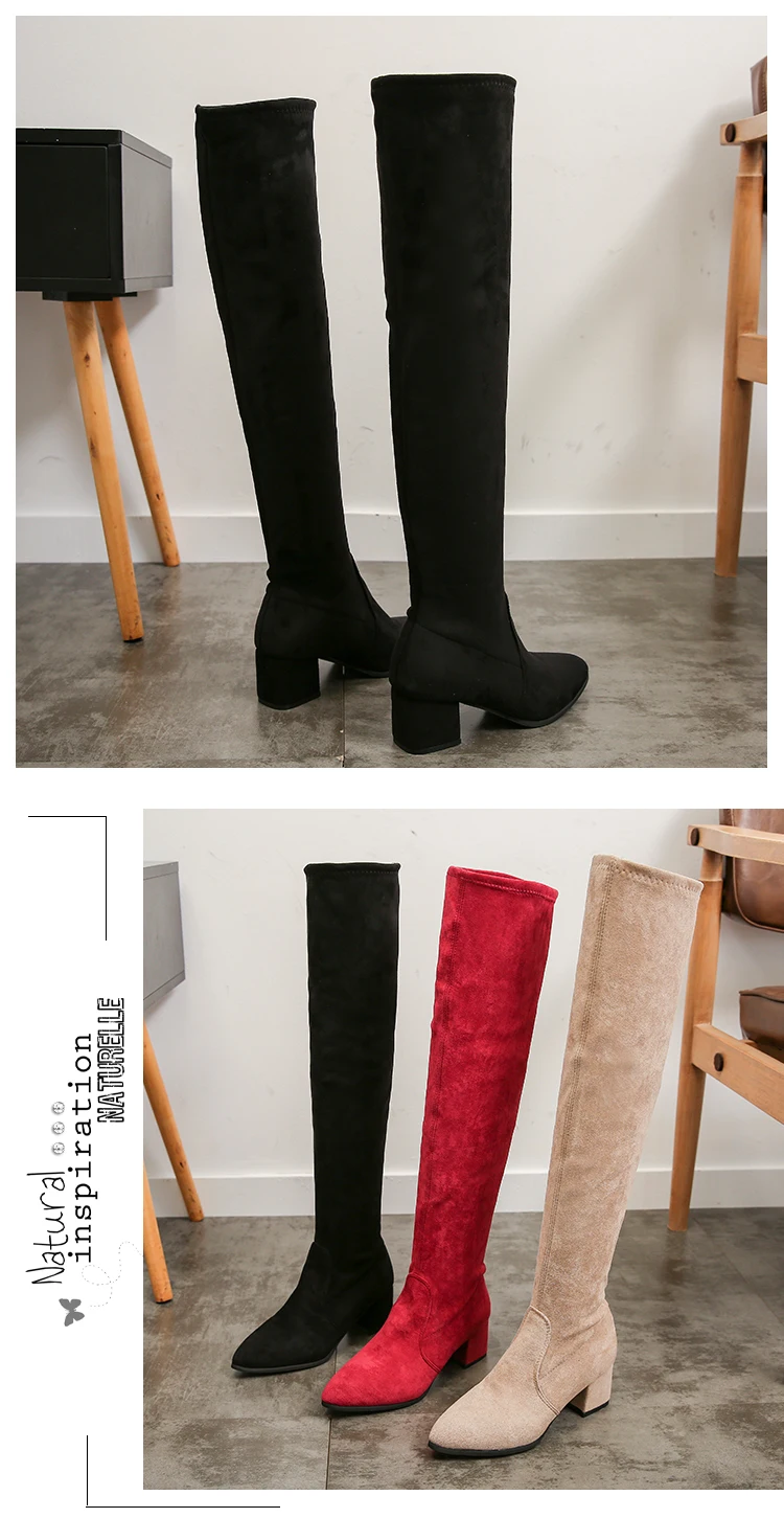 женские зимние Женские сапоги Женские высокие сапоги до бедра, зимние модные новые сапоги 2021, женские привлекательные замшевые сапоги на каблуке, Красные Теплые черные сапоги с мехом и острым носком, большие размеры