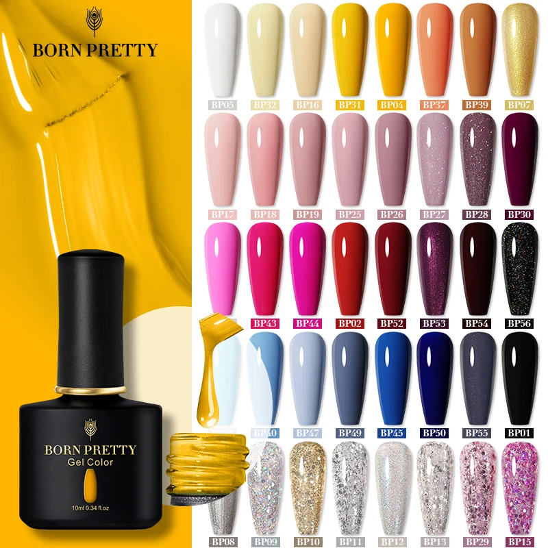 Гель-лак BORN PRETTY для ногтей 10 мл, 60 цветов, все для маникюра, отмачиваемый полуперманентный Гель-лак, суперверхнее покрытие, блестки