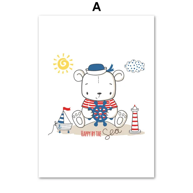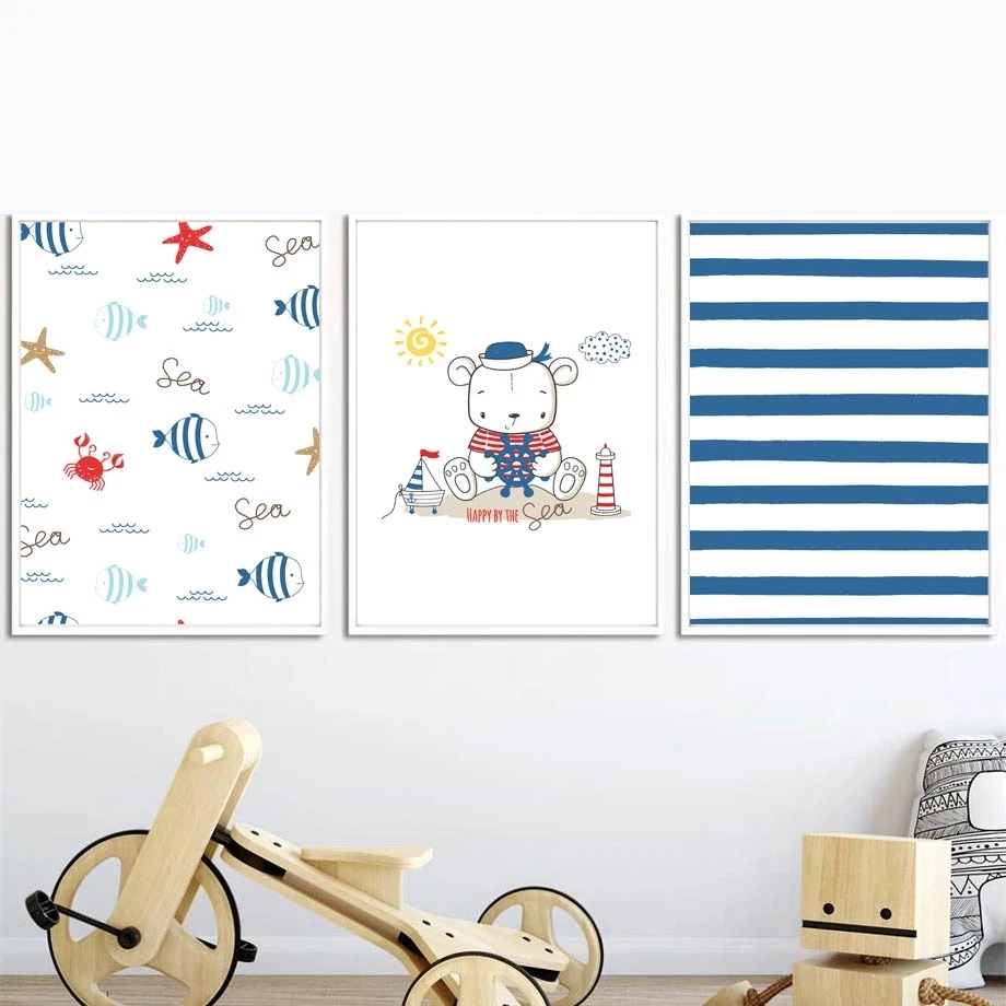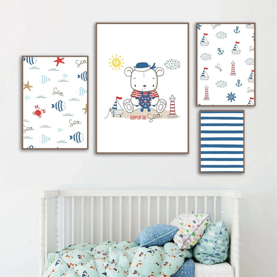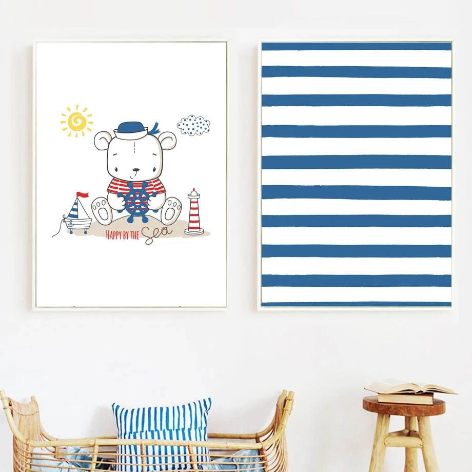 Детская комната украшение для дома картина морские элементы мультфильм холст картины синие и белые полосы Сейлор Капитан плакат