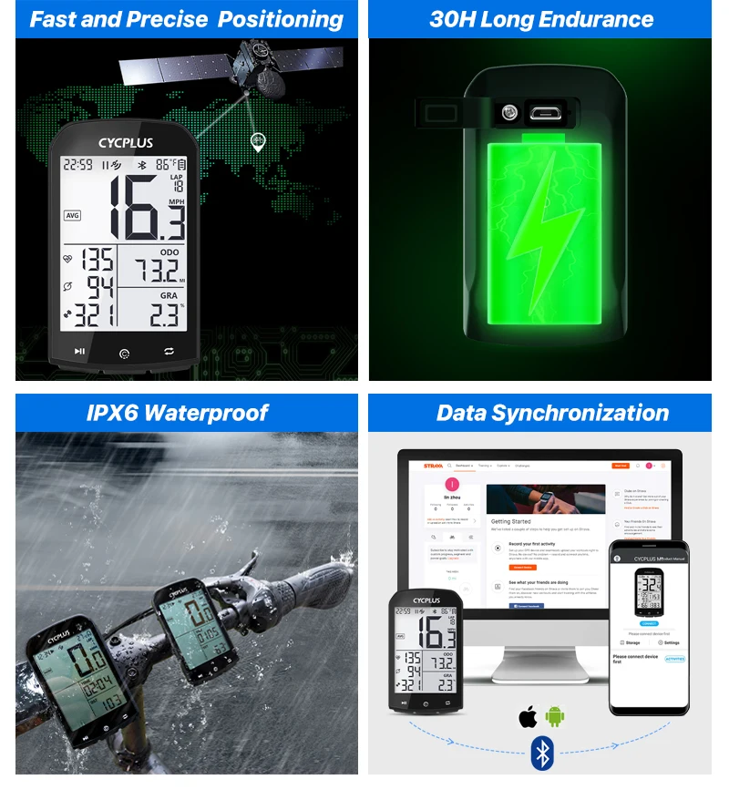 -Отображение данных в реальном времени: Максимальная/Текущая/Средняя скорость, частота сердечных сокращений, мощность, градиент; Время, расстояние, подъем, ODO, высота, температура