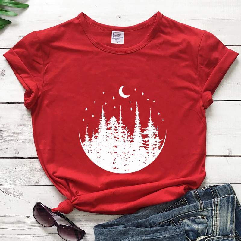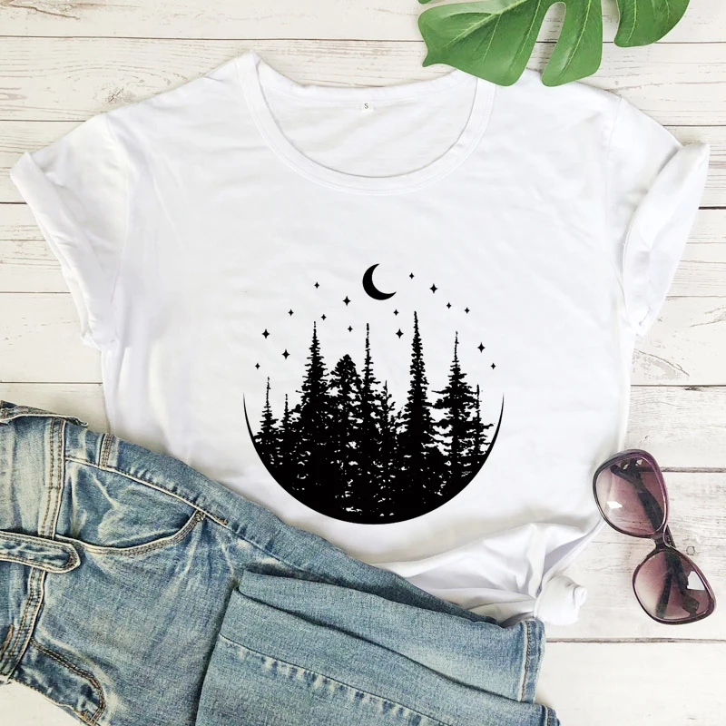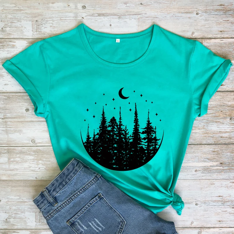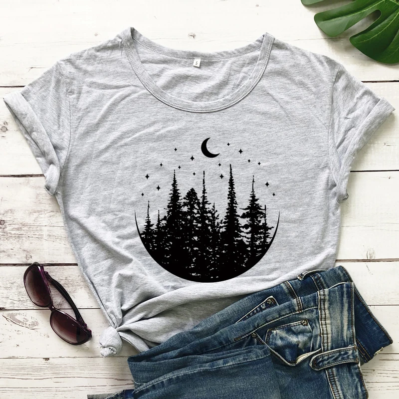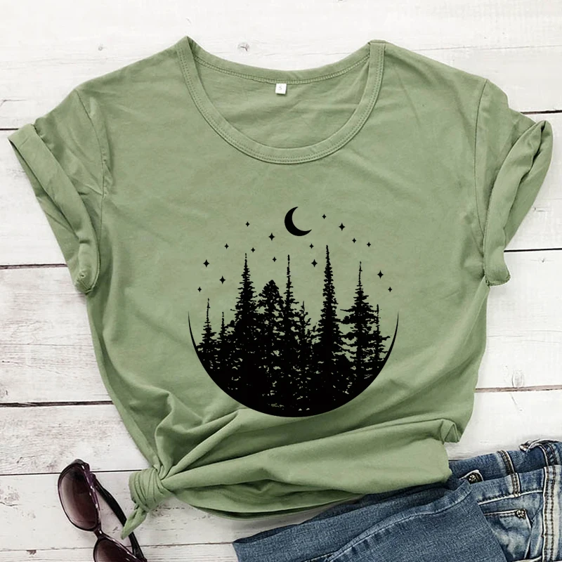 Футболка женская хлопковая с изображением сельстиаль Луны и деревьев, винтажная рубашка с коротким рукавом, топ для походов и путешествий, 100% хлопок, на лето