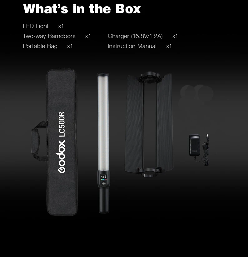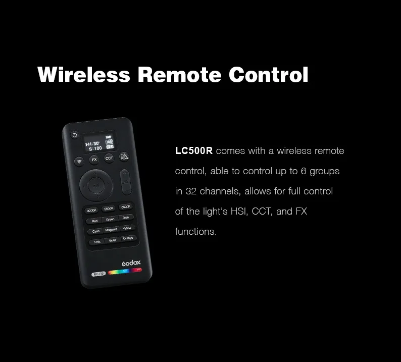 4. Пульт дистанционного управления и Barndoor include】 LC500R поставляется с беспроводным пультом дистанционного управления, который способен управлять до 6 групп в 32 каналах, что позволяет полностью контролировать светильник HSI, CCT и FX функции. Двусторонняя барная дверь также включена для пользователей, чтобы придать форму и направить светильник.