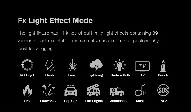 3 【 14 FX светильник ing Effects & Creative Music Mode:】 светильник имеет 14 видов встроенных FX светильник ing effects, содержит в общей сложности 39 различных пресетов для более творческого использования в фильме и фотографии, идеально подходящих для vlogging. С встроенным микрофоном, творческий режим воспроизведения музыки, позволяя светильник изменить ее цвет и светильник яркости ритмом музыки изменения, имитируя резкое диско-как вариант.