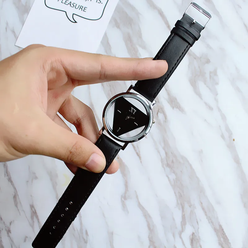 Часы женские кварцевые с кожаным ремешком, простые оригинальные креативные модные наручные, с треугольным циферблатом с отверстиями, чёрные белые
