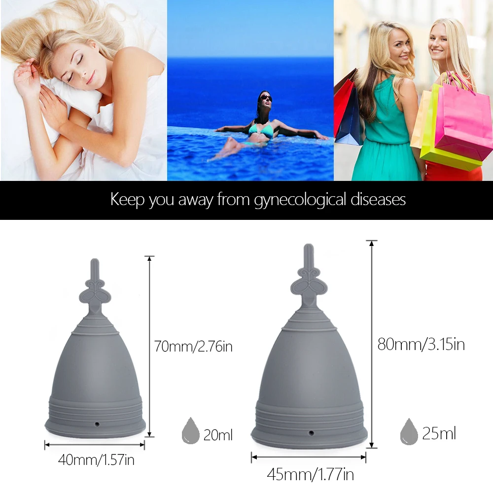 Менструальная чаша размера S подходит для нормального потока. Менструальная чаша размера L подходит для интенсивного потока. Мы рекомендуем вам купить менструальные чаши двух разных размеров, чтобы справиться с различными менструальными условиями.