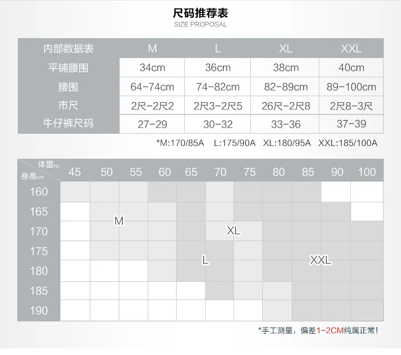Размер: Размер M, как правило, рекомендуется выбирать размер талии на 2 стопы или меньше, обычно отлично сидят джинсы размера 29 или меньше В размере L обычно рекомендуется иметь обхват талии около 2 футов 2-4, обычно отлично подойдут джинсы размера 30-31 Размер XL обычно рекомендует обхват талии около 2 футов 4-6, обычно джинсы 31-33 размера отлично подходят Размер XXL обычно рекомендует обхват талии около 2-6 футов-2-8. Обычно джинсы хорошего размера 33-35