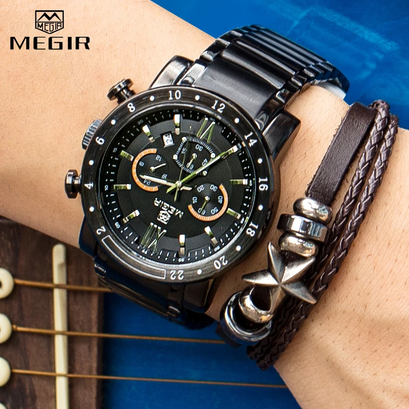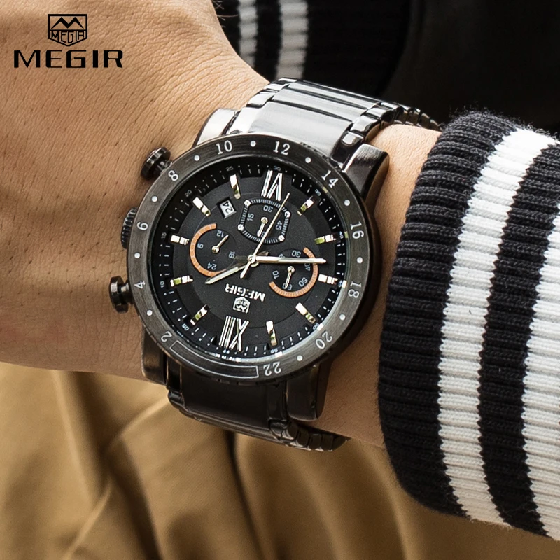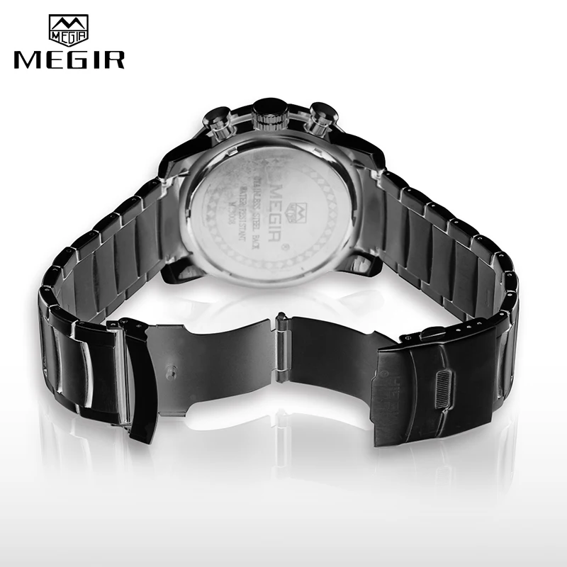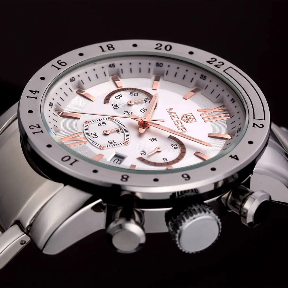 Часы наручные MEGIR Мужские кварцевые, модные спортивные водонепроницаемые полностью стальные деловые с хронографом и датой, 2021