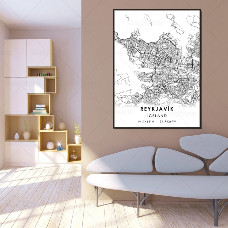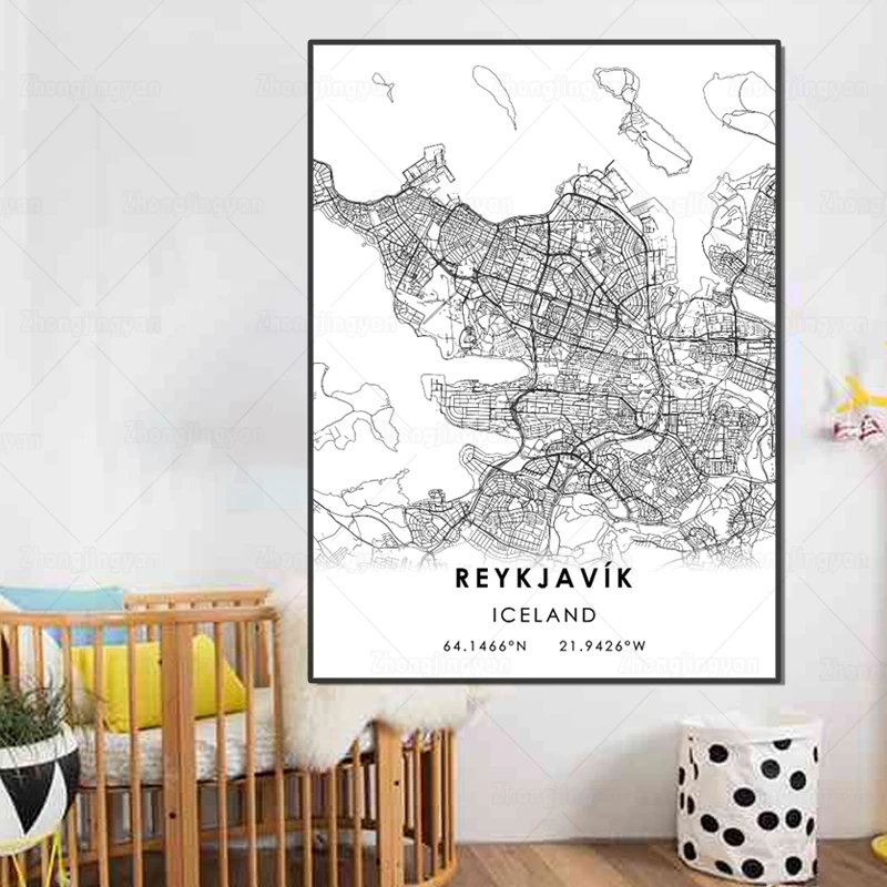 Черно-белая карта города Исландия Рейкьявик карта Плакат HD печать на стене искусство на холсте нордическая картина Landspace для домашнего декора