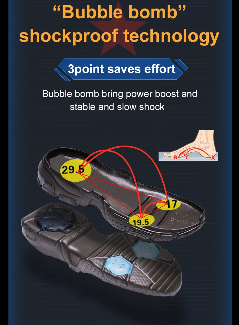Противоударная Технология «Bubble bomb»3 точки экономит усилияПузырьковая бомба обеспечивает усиление мощности, стабильный и Медленный шок"Воронка" лакированная стелька2 слоя чистоты, не воняют ногиЛакированная стелька сохраняет подошву сухой и чистойДиван не хромает1. Бесшовная пленка для внутренней поверхности