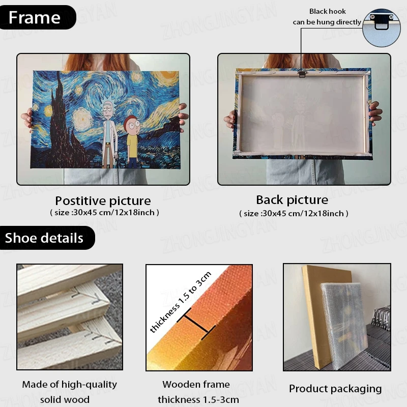 1. Мы оснащены черными канавами, которые можно повесить непосредственно после получения.2. Толщина деревянная рамка является 1,5-3 см.3. Мы используем пенопласт и картонные коробки, чтобы убедиться, что упаковка является твердой и скорость повреждения почти равна нулю.