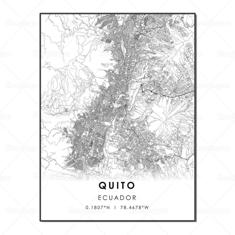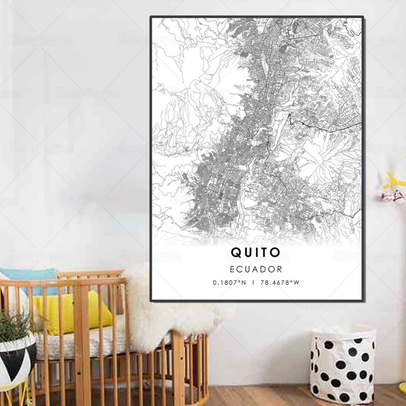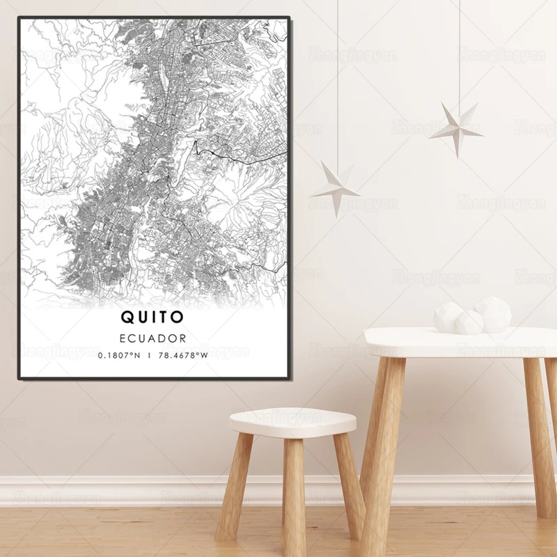 Черно-белая карта города, Эквадор, карта Кито, плакат, HD печать, настенное искусство, холст, скандинавский ландшафт, живопись для домашнего декора, художественное оформление