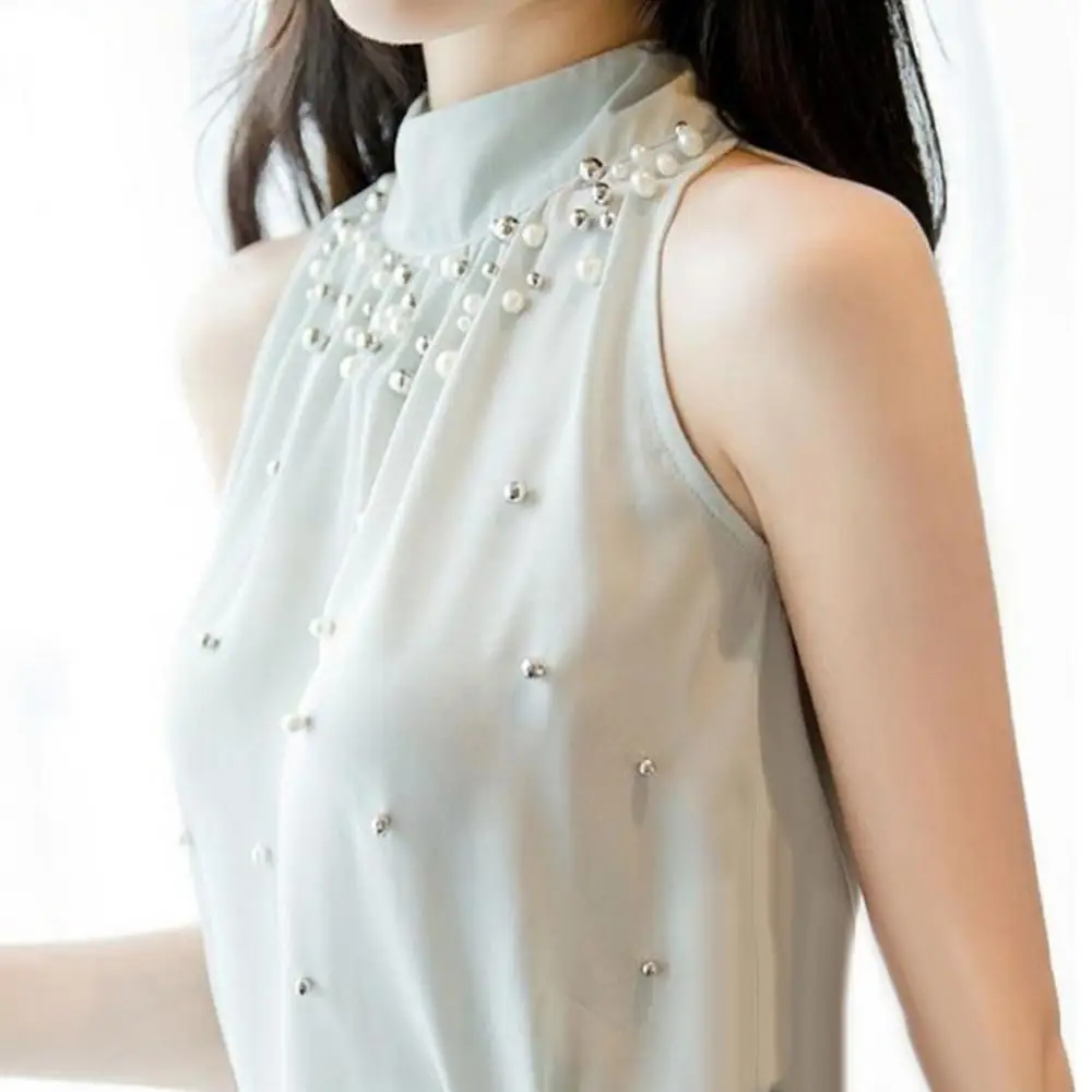 Женская шифоновая блузка без рукавов, с ложным воротником и бусинами