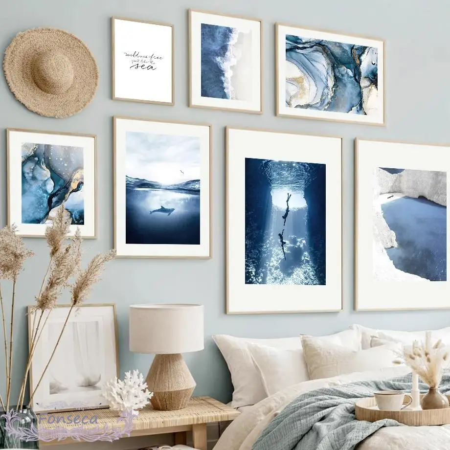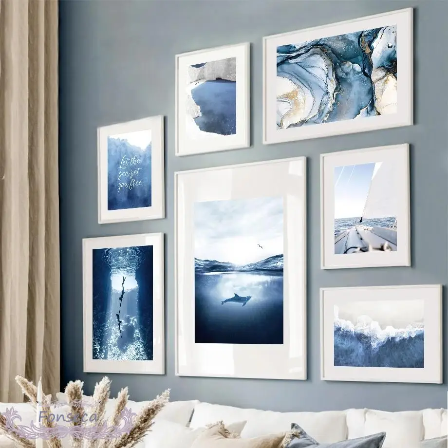 Настенное художественное полотно, живопись, синий океан, дайвинг, морской Кит, белый песок, горка, плакаты пляж и принты для декора гостиной