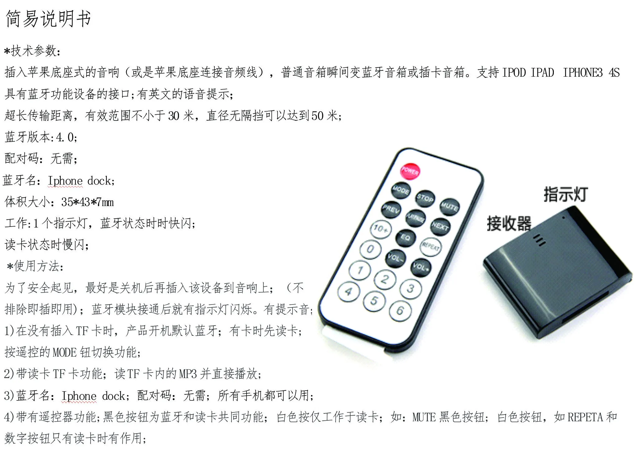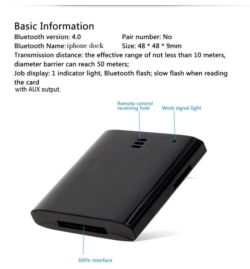 Название адаптера: док-станция для IPHONEРасстояние передачи: не менее 10 метров, большой-30 метров.