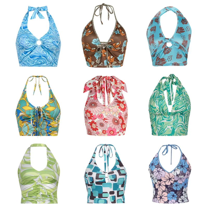 Майка женская с цветочным принтом, пикантный топ с открытой спиной, халтер без рукавов, повседневная майка разных стилей, на лето