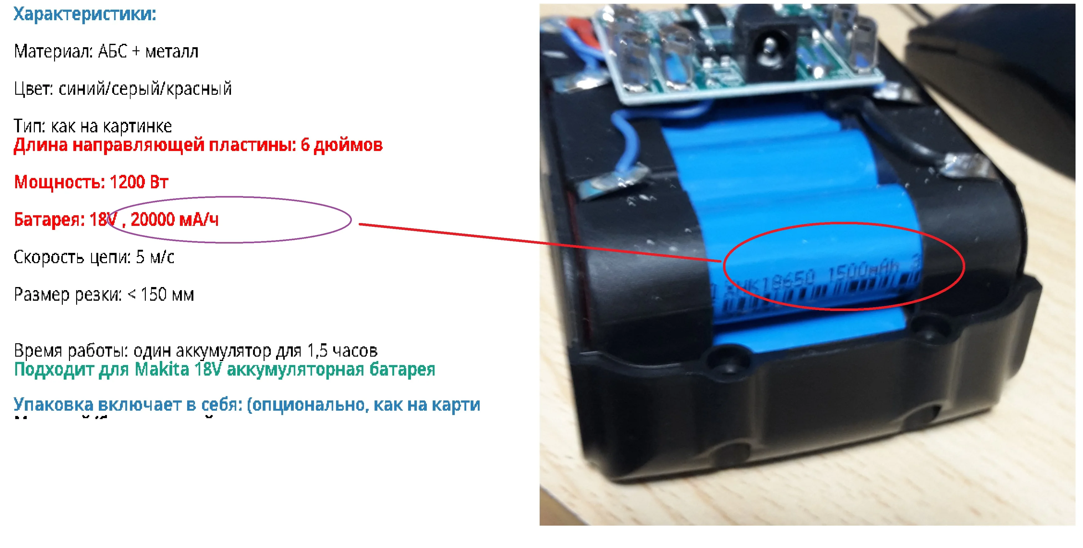 В описании написано: "6-дюймовая бесщеточная/матовая цепная пила, беспроводная Электрическая цепная пила, Ручная обрезка, портативный режущий инструмент" , а на самом деле двигатель обычный со щетками. На картинке аккумуляторы с индикатором зарядки. Пришли аккумуляторы без индикатора зарядки. Заявлена емкость аккумулятора: "Батарея: 18V , 20000 мА/ч", а насамом деле 10Х1500=15000 мА/ч.
